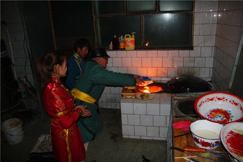 按照有关资料记载,与汉族“祭灶神”不同,蒙古族祭火要用羊胸叉骨、奶食品、酒等供品。在每年的农历腊月二十三,二十四日举行,主要是祭火神、祭灶神。农历腊月二十三是成吉思汗圣火祭祀之日;家庭香火祭祀则在腊月二十四。在蒙古人看来,火是神圣的。一家一户的祭火,有继嗣之义,举行婚娶大事、新年,也要祭火。围绕火盆、炉灶,有着一系列祭礼。此外还有很多有关火的禁忌反映蒙古人对火的崇敬,如不能向火中泼水,不能用刀、棍在火中乱捣,不能向火中吐痰等等。