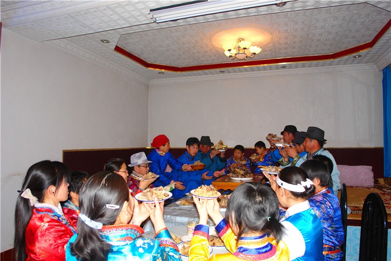 之后,全家人各端一个盛着炒米、茶叶、红枣、黄油、羊胸脯肉等食品的小木盘或碗,坐地准备招福,大家一起说:“胡列!胡列!(福来!福来!)”这样说着顺时针绕三次手中之物。保佑全家人健康快乐万事顺心,牲畜兴旺之意。