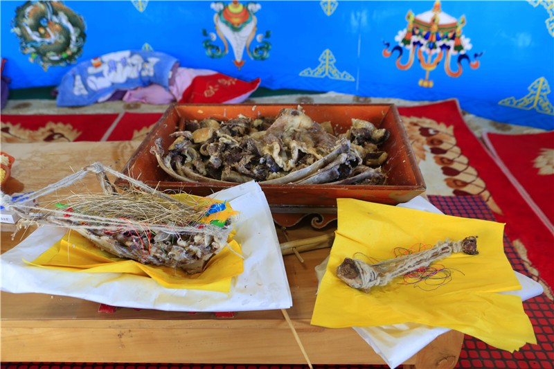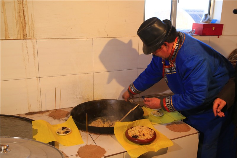 主人将洗净的锅用油涂抹后放进少许奶食,再将羊胸叉、灌肠等放入锅中煮熟,煮熟后,羊胸叉的肉给削开。将羊胸叉骨内填满红枣、黄油、冰糖、奶酪、柏叶、哈达等,用白色羊毛线缠绕九圈。煮过羊胸叉的肉汤中放入大米、糜米,并放入适量的奶酪、红枣、葡萄干煮成干饭,蒙语称之为“嘎林布达”,这是蒙古人独特的饭食,味道非常可口,蒙古族民众认为这是一年中最丰盛的饭。