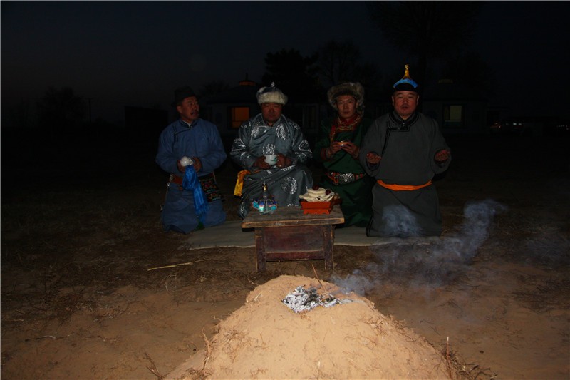 隧石为母,火镰为父,榆木的生命,仁慈的火神。黄油白酒为食品,有七彩光亮火焰,有烈焰冲天放光芒,有洞穿大地穿热量,是成吉思汗点燃,是孛儿贴可暾擞火,是哈赤温额珍护卫,是栋岱青那颜接来,有彤红的装扮,有绵羊胸骨为祭品,闪光的火神。 斟上满杯的美酒,奉上丰盛的祭品祭祀您了!