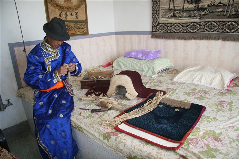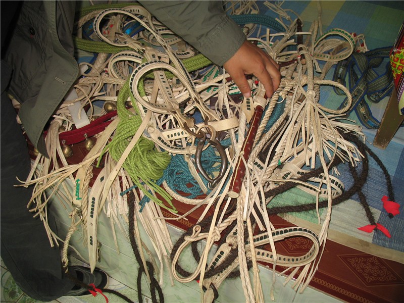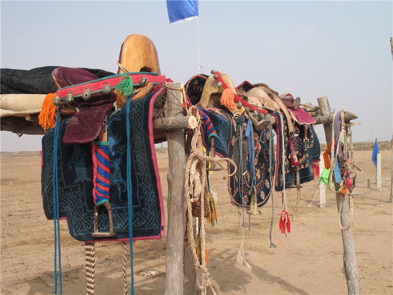 所以马具是不可缺少的一部分。如马鞍、套马杆、套马绳、缰绳、配套用具、装饰用具等等。马鞍由鞍板、前鞍鞒、后鞍鞒、接缝组成。其它辅助器具有:毡垫、鞍屉、前皮捎绳、马镫、肚带、鞍泡钉、鞍扯肚、后皮捎绳、后鞧等。套马杆(套马绳)是一种特制的套马用具。缰绳有马龙头、马嚼子等组成。配套用具有马绊、马鞭、取汗工具、烙马印、去苍蝇工具、马蹄铁等。装饰用具有马铃、刺绣护额等等。