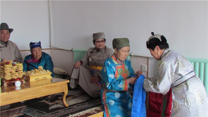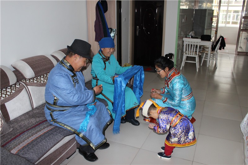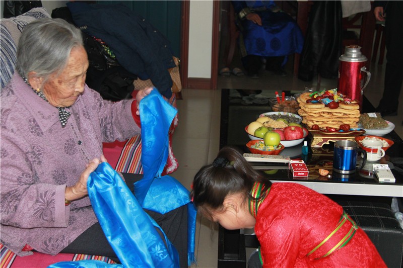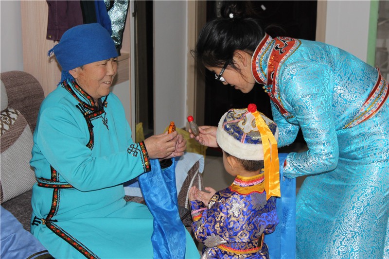 二是春节期间听祝福词时,让长者坐着,晚辈献哈达,磕头聆听颂词(磕头的时男性右膝跪地,女性左膝跪地)。听完颂词后交换鼻烟壶。