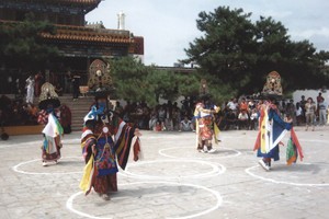 《查玛》是一种以演述宗教经传故事为内容的面具舞。人物繁多,形态各异,分"大查玛"(主要神祗)和"小查玛"(泛指鸟兽及侍从)两大部分。有殿堂舞、米拉佛传舞、寺院舞、大场舞四种表演形式。独舞、双人舞、多人舞、大群舞一应俱全,亦可穿插即兴表演、表演程式化、规范化。舞蹈语汇的运用多以所表演人物的个性划分。一般是"大查玛"动作沉毅坚定,庄重徐缓;"小查玛"动作乖巧多变,灵活敏捷。表演时二者相映相衬,各具特色,如《却吉勒(阎王)舞》动作劲拔犷悍,举手投足极富雕塑性;《鹿神舞》动作矫健奔放而有气势,技艺性强,带有竞赛性质;《骷髅舞》动作灵活洒脱,时而随鼓声颠跑跳跃,时而故作威风状进行喜谑表演,身体的起伏,头部的昂垂;手的绕动,舞步的踏跳配合融洽,很有韵味。查玛舞在蒙古地区流传十分广泛,绝大多数寺端均于宗教节日的表演。
