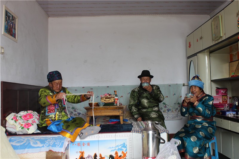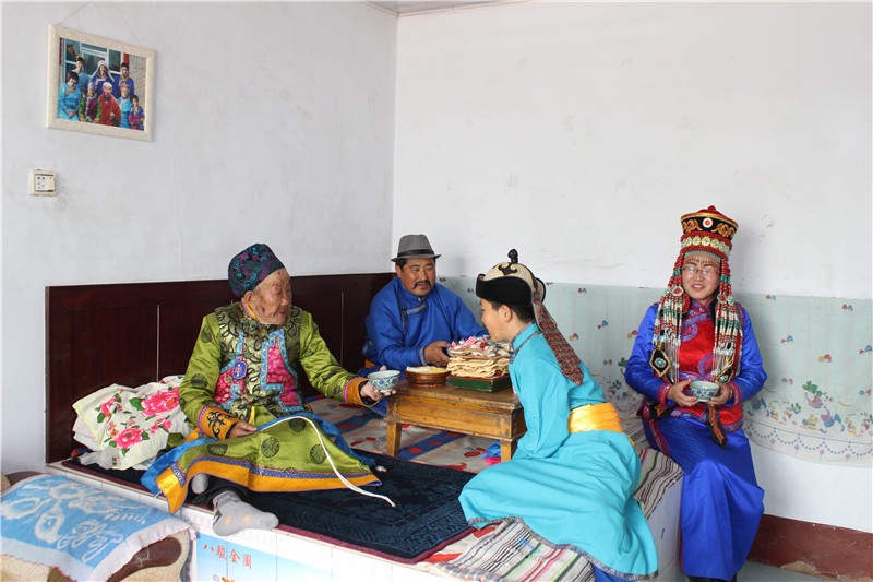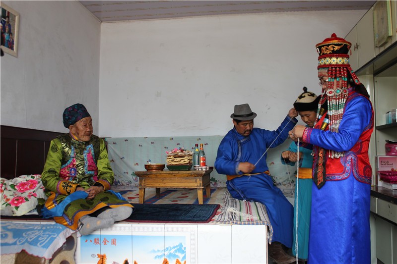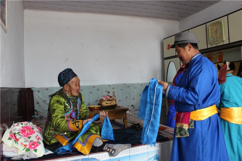 杭锦旗蒙古族在查干萨日(正月)拜年时将念珠放在哈达上献给老年人和德高望重的喇嘛,以示尊敬和祈盼老年人和喇嘛长命百岁,寿比南山。蒙古族有的妇女到了60岁去寺庙里当尼姑,请寺庙里的大喇嘛或主持念经并消发为尼,寺庙的主持和大喇嘛给消发为尼的老人赠送念珠,祝福老人一生平安。老人将自己搓好的系带把念珠的珠子连接,开始念经,成为真正意义上的尼姑。念珠系带是6—8根棉线组成,将线的两边搓成3寸,中间的线原封不动。用8根棉线制作的系带用于比较大的念珠,用6根棉线制作的系带,用于比较小的佛珠。