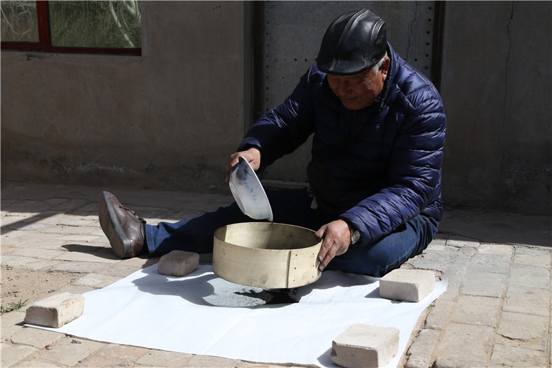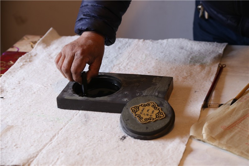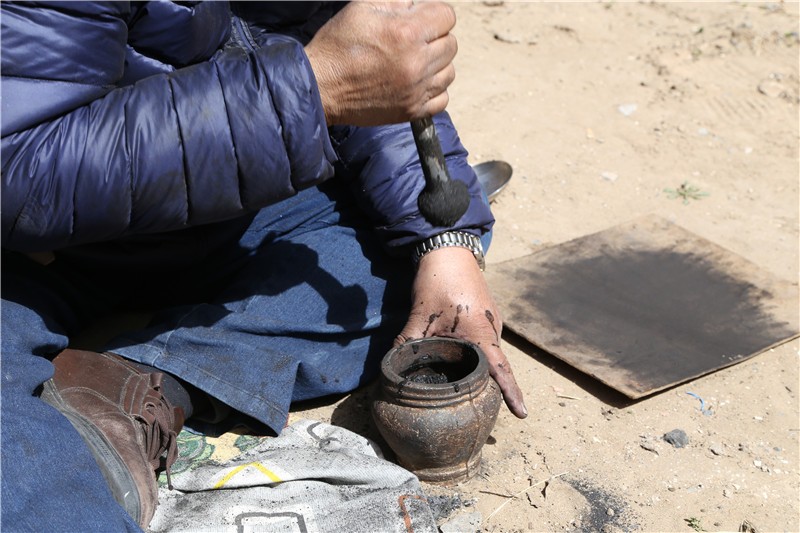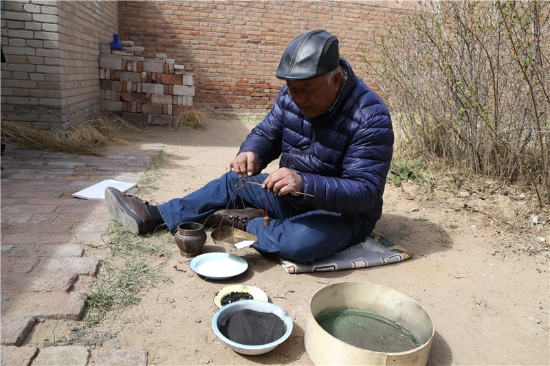 制墨是东方独有的具有悠久历史的传统手工艺,墨从粗糙的原料变成可以让人使用、赏析、收藏的珍贵艺术品。蒙古族传统制墨方法沿用了汉族制墨的基本方法,根据游牧民族特点,就地取材制墨,主要采用沙蒿、柠条、树脂烟灰作为原料,通过选烟、加料、拌合、加胶、捣杵、压模、凉墨工序等工序完成。选烟设备是四周围起来约18米的方形空间,排着大小不同的灶,小的灶采集的煤品质比大的灶采集的好。除了选烟之外,胶是决定墨质的首要因素,好的胶能造出好的墨,蒙古族制墨胶质通常用牛皮胶。另外在制墨过程中加入香料是为了消除墨中胶的气味,通常用动物性的麝香和植物性的龙脑(冰片)都是受到重视的珍贵材料。其次是炼墨。煤和胶正式融合的时候是开始炼墨时。煤的颗粒很小,连人呼吸的震动也会使粒子飞散,很容易和灰尘混在一起,墨的品质会因此受到影响,为了除去煤中的夹杂物,必须先过滤。然后在火上架好一米宽的木板,通常放煤600—700克,胶120—140克,煤和胶就在这块木板上调和均匀,不同的墨所放的份量不一样。技巧、火候的掌握决定产品的好坏,另外如何搅拌、软硬的程度、色泽等,都不能忽视。除了揉搓之外,墨匠们还是用木臼、石臼、铁臼来捣。然后是墨的成型。将揉拉、搓好的墨团放入模具中使其成型。模具大部分用梨木、樱花木来做,模具设计好后将墨团放入加压,即产生形态丰富、具有匠意的墨碇。