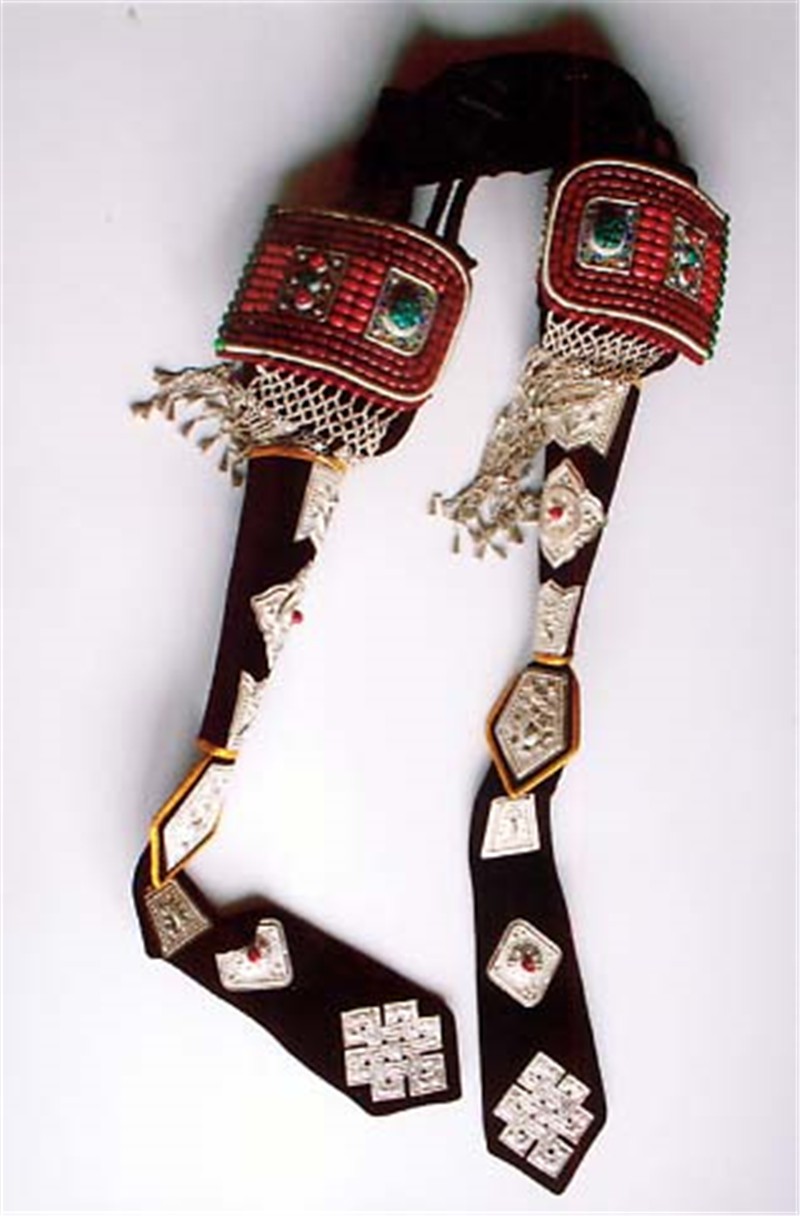 特别是鄂尔多斯妇女的头饰有着古老的人类文明发展史,掀开了鄂尔多斯蒙古族文化发展史上新的一页。鄂尔多斯蒙古族妇女的头饰主要以“连垂”和“发套”两大部分组成。连垂,蒙古语称“西布格”,是用布和棉絮制成的两个扁圆形物和其下伸出的两截约五寸长的木棒,系戴在已婚妇女脸庞两侧梳留的发辫上。传说这是成吉思汗时期的遗留物。当初,蒙古各部落之间经常争战不息,战胜者在被俘虏的妇女们的头发上系很长的木棒,以防止她们逃遁,久而久之,头发上系木棒便成已婚妇女的礼俗、所不同的是长木棒逐渐变成小巧玲珑约五寸长的小木棒。后来,妇女们又在小木棒上制作了精致的圆锥形外套,上面还绣有各种美丽的花纹图案,缀上金、银制作的工艺品,使其成为精美而绝妙的头饰。在小木棒上部的扁圆形物的外面,又加做了蒙古语称“敖日雅德格”的布垫,其上缀满珊瑚、金银制品。