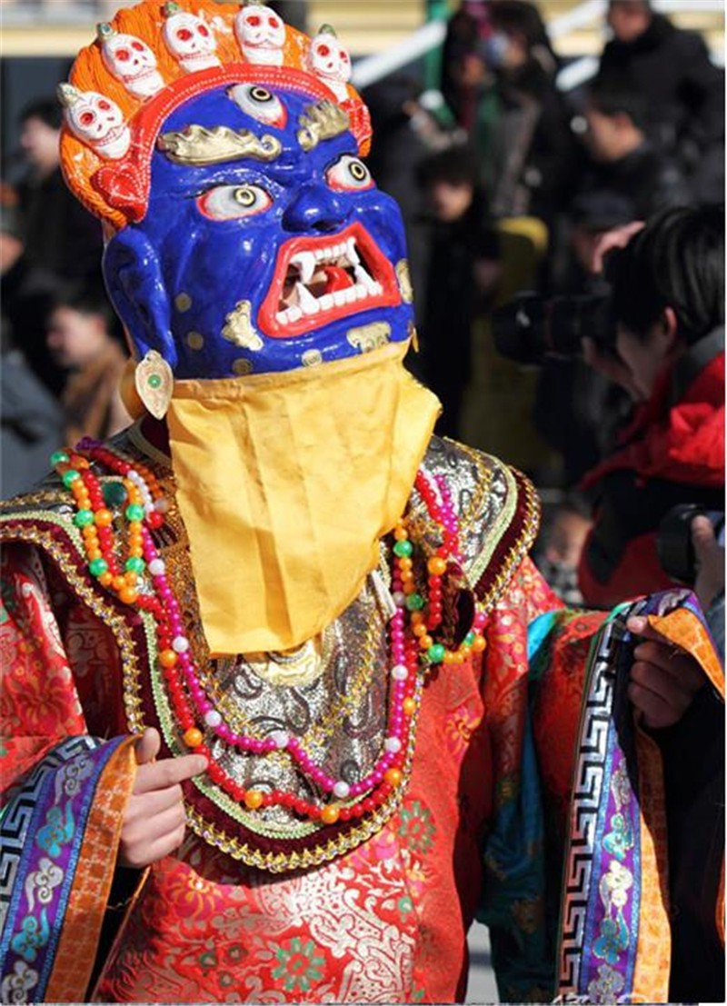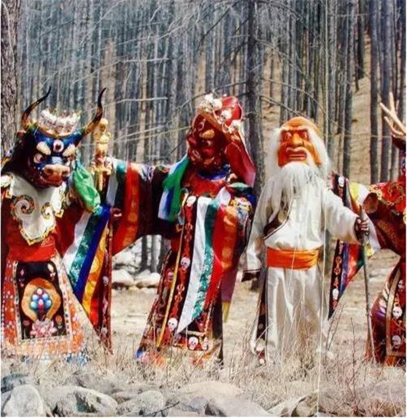 查玛服饰即查玛表演服饰,多由蟒缎和璎珞裁剪缝制而成,衣襟上缀有瑞金(念珠子),颜色造型特色鲜明,机具浓厚的民族宗教色彩。但目前已很少见到完整保存的原始实物,亟待抢救发掘。