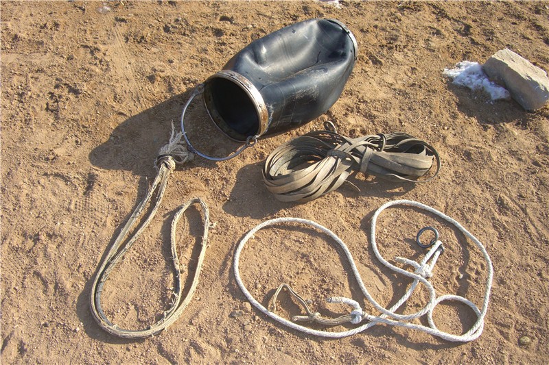 深井提水工具主要有井架、额尔古勒格(滑轮)、“其日嘎音德额斯”(提水绳)、“周鲁尔”(连接绳)、“彻吉”(彻肚)、“希吉木”(系斗绳)、“乌特呼尔”(水斗)等组成。其中深井提水绳是用整张牛皮切割而成。制作提水绳的牛皮是要鞣制工艺十分考究。其日嘎井提水用的传统水斗都是用囊制,选用二岁小牛、山羊、黄羊等的整筒皮囊,经特殊工艺鞣制后加工制作出来。