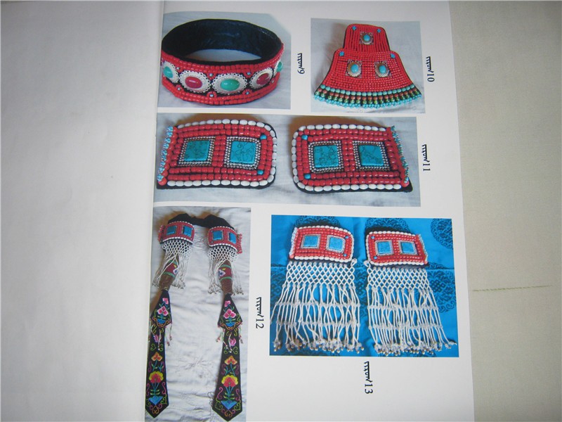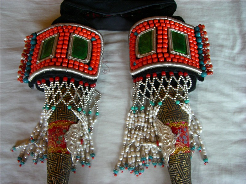 第三部分为“金银珠环”,在头套两侧的饰片处还要附一对或两对金银饰件夹带有珊瑚珠的环状穗饰,这种穗饰的环有圆环、勾环,往往一对一对分别出现,有时两对中圆环和勾环同时出现。