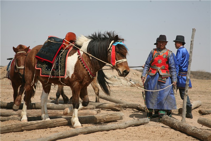 北方草原是蒙古人的历史摇篮,那么矫健的蒙古马就是蒙古人创造历史文化的主要工具。马在蒙古族的生活中,在民族的成长发展中的确是太重要了。因此,从古至今,蒙古族不论从事什么职业,对马都有着特殊的感情。在蒙古族的生产劳动、行军作战、社会生活、祭祀习俗和文学艺术中,几乎都伴随着马的踪影,听得到马蹄的声音。由此,就自然而然地在民族生活中形成了多姿多彩的马文化。蒙古族马鞍的基本形制,可分为方脑(前桥)鞍和尖脑鞍两种,其中也有大尾(后桥)式和小尾式的区别。如今草原上的匠人能制造出十分合体的马鞍,不但主人骑着舒适,连马也会感到舒服。有些讲究的马鞍子,都要作各种装饰,刻制各种花纹图案,镶嵌骨雕或贝雕,也有用景泰蓝装饰的马鞍。马鞍其他部位也都加以美化,如软垫、鞍桥、鞍韂、鞍花等,还有辔头上的鼻花和腮花等银饰件,更显得华丽夺目。其制作工艺精美,是罕见的艺术晶。好马配好鞍,胜过龙驹。这是蒙古族悠久的马文化结出的硕果之一。马是牧民生活中的资源财富,是草原上日常生活中的交通工具,是军队作战的制胜法宝,也是诗歌文学的重要主题,是蒙古族欢庆娱乐的亲密伴侣,更是他们美的心灵和理想借以寄托的载体。所以马在蒙古族的全部社会生活中,始终具有着重要的意义。