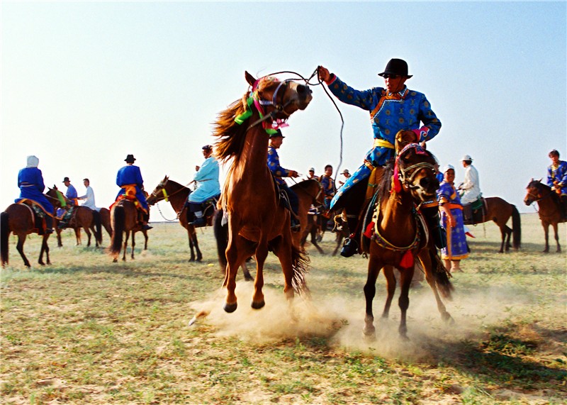 鄂尔多斯历史悠久,自然也是马的故乡。如果有机会到绿茸茸的草原上瞧一瞧,一群一群的骏马,像团团移动的彩云贴地而奔,枣红、绛紫、雪青、虎黄、斑玉、海栗各色马匹,有的昂首苍空,啸啸欢鸣;有养精蓄锐,在湖边觅食青草;有的狂奔乱跑。人们不仅看到了马的骏美,更领略到了马背上的民族咤叱风云的雄风。蒙古民族生活在这样沸腾的生活中,怎不叫赞美与歌唱!马勇敢、柔顺、善解人意。接受人对它的驾驭,从不欺侮弱小的动物;合群,热爱集体生活。由于蒙古人年年岁岁同马在一 起,才锻炼出蒙古民族这种粗犷豪放的性格,敦厚质朴的感情,机敏果敢的气质。
