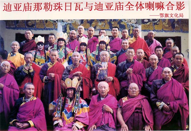 许多小喇嘛吹着唢呐、笛子、喇嘛号,请身穿法衣的念经者,从各自的殿里(达嘛是从自己的藏行,专门为女喇嘛经殿。平时达嘛是不允许进入其它经殿的)走出,打着伞大摇大摆地聚集在主殿门口。那勒珠日瓦指定穿龙花长黄袍,头戴串有象牙帽;达嘛(女喇嘛)身穿单绿色蒙古袍,头戴乌木赛日阿(五莲花帽)。他们是以一个主教徒—那勒珠日瓦和八个(一般以八个达嘛较多,也可由更多女教徒达嘛组成。他们不在主殿门口也不在主殿里边而是在主殿的二层阳台上念经。因为这种男女密宗经在鄂尔多斯地区乃至全区也除了迪亚庙外其它地方绝无仅有。所以,从阿拉善、杭锦旗、乌审旗、巴盟等周边地区赶来许多信教徒观看朝觐,热闹非凡。此密宗主要以阴阳为主题,赞美人世间的真善美,什么是善,什么是恶,宇宙为什么有天有地,人间为什么有男有女,动物为什么有公有母等一系列自然科学的常识,以教育人们要爱护自己的兄弟姐妹,尊重自己的父母亲人等内容。