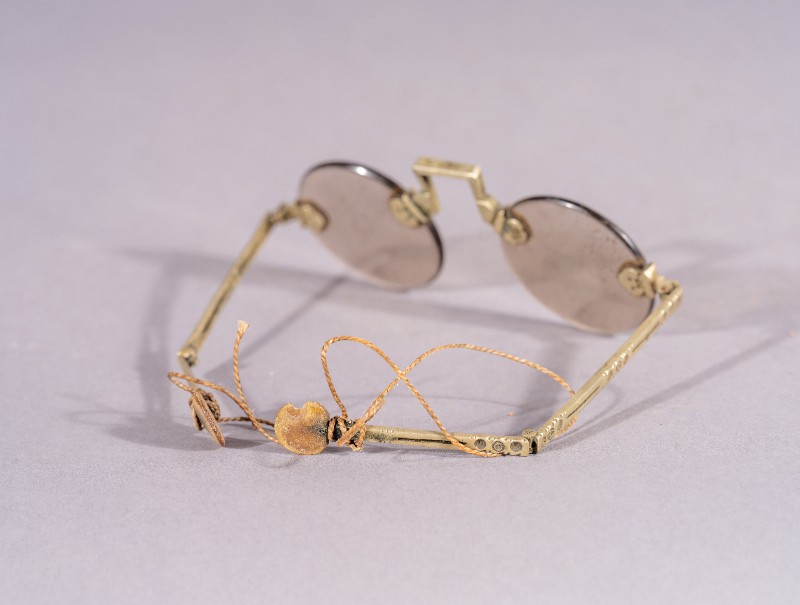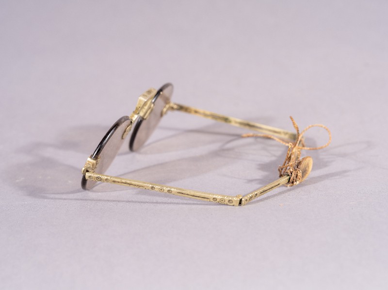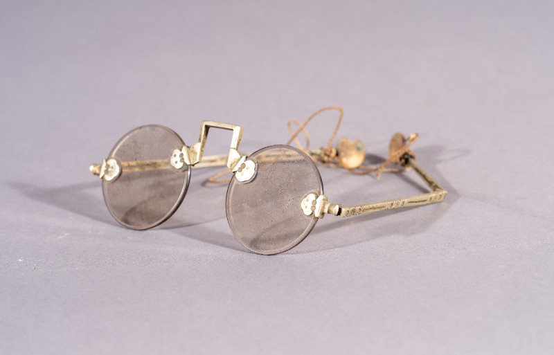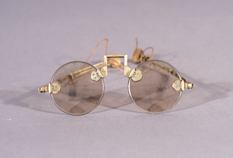 眼镜,材质为铜、水晶,捐赠物品,器身基本完整。抗日战争时期,陕甘宁边区派往三段地革命工作者使用过的眼镜。现存于三段地革命历史纪念馆。