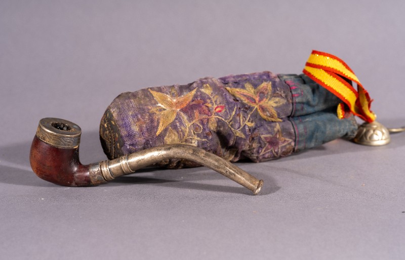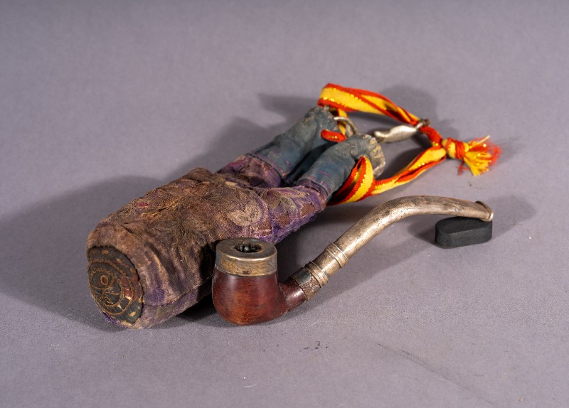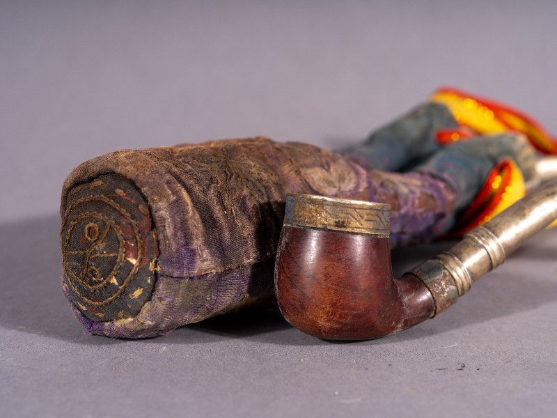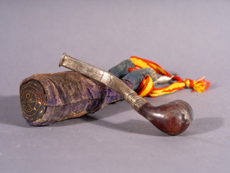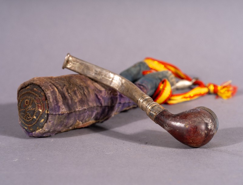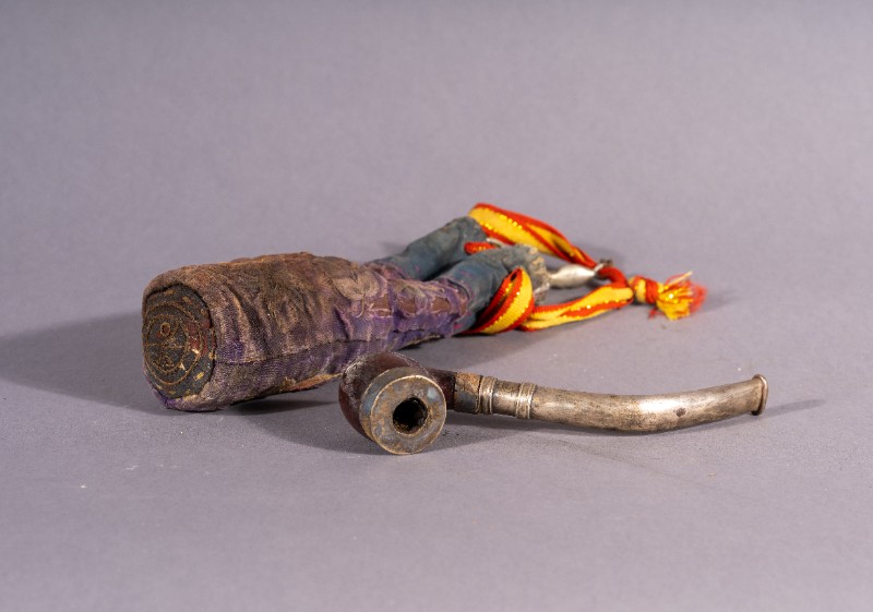 铜烟斗,材质为铝、铜、木;绣花烟袋,材质为布;两件均为捐赠物品,器身完整。清代,鄂托克旗开明大户使用过的铜烟斗及绣花烟袋。现存于三段地革命历史纪念馆。