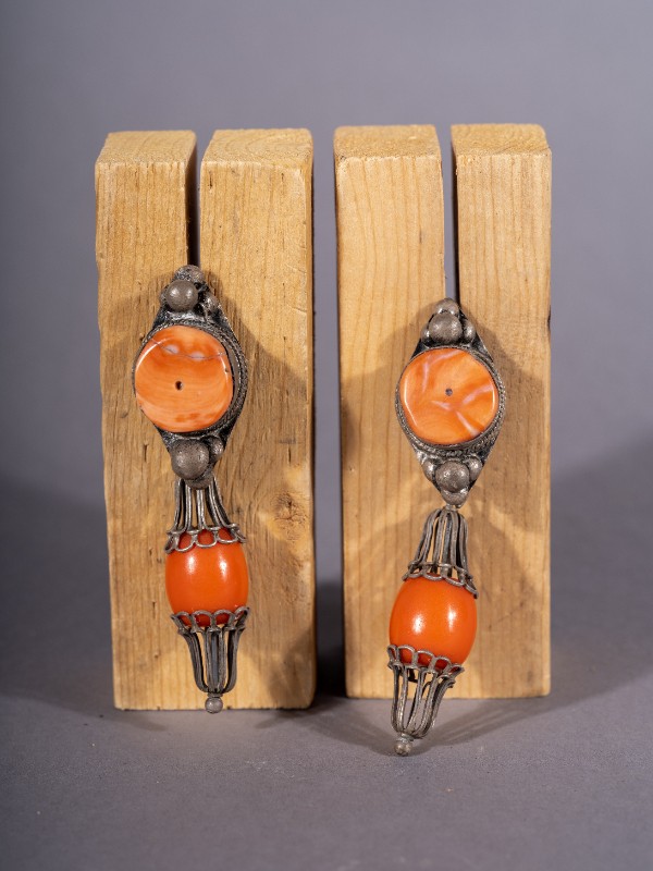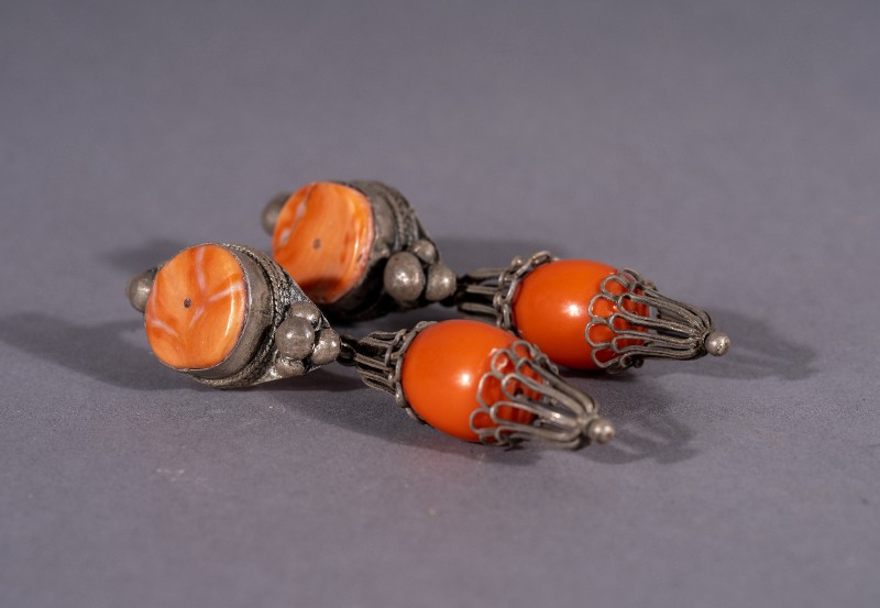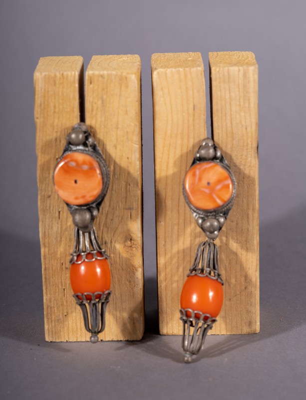 镶银珊瑚耳环(一对),材质为珊瑚、银,捐赠物品,器身完整。民国时期,鄂托克旗开明蒙古族贵族使用过的耳饰。现存于三段地革命历史纪念馆。