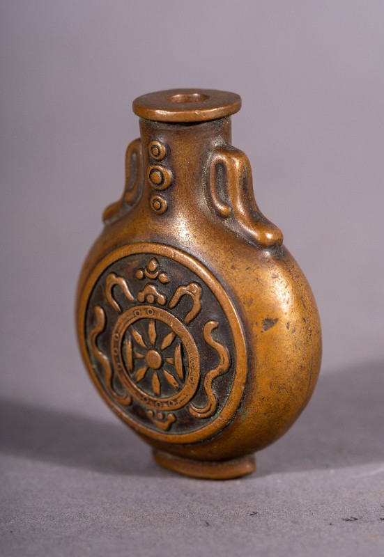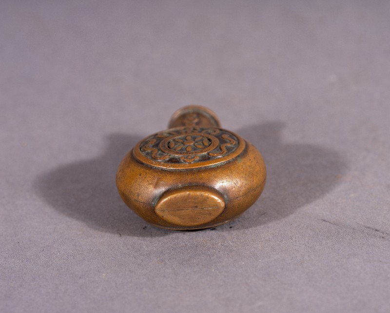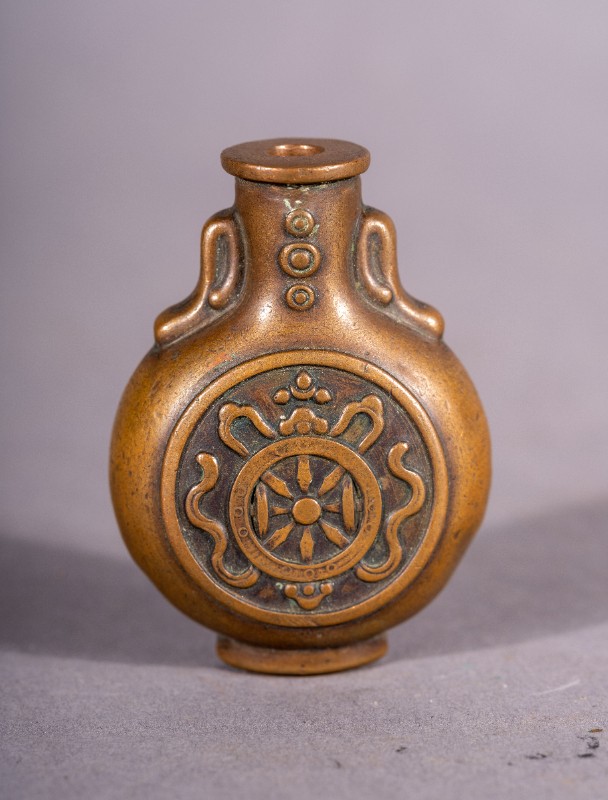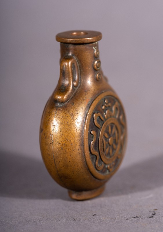鼻烟壶,材质为铜,捐赠物品,表面微瑕。民国时期,三段地上层蒙古族使用过的黄铜鼻烟壶。现存于三段地革命历史纪念馆。