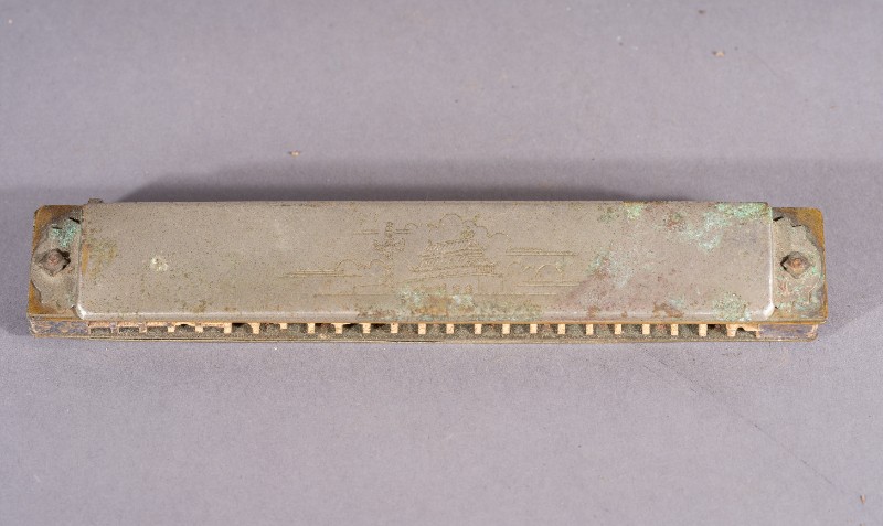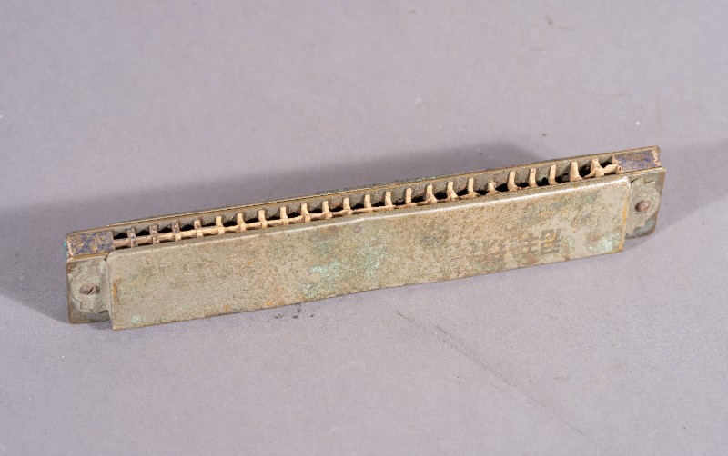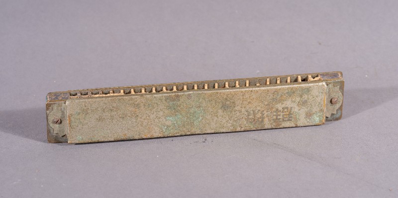 群众牌口琴,材质为铝、木,器身微残。上世纪40年代,鄂托克旗文艺工作者使用过的群众牌口琴,背面刻有天安门城楼及华表图案,刻有“公私合营”“中央口琴厂出品”。现存于三段地革命历史纪念馆。