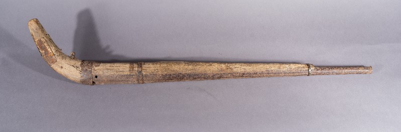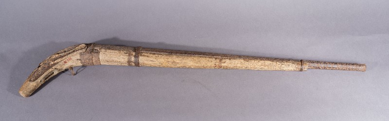 火枪,材质为铁、木,器身有残缺。1940年左右,鄂托克旗进步群众在党的领导下开展抗日救国,反对军阀所使用的火枪。现存于三段地革命历史纪念馆。
