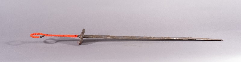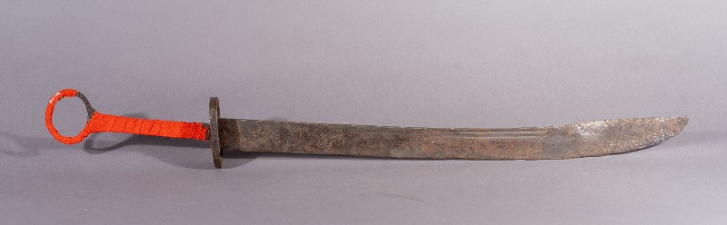 红军大刀,材质为铁,器身基本完整。上世纪40年代,陕北红军在鄂托克旗开展反帝反封建斗争时所使用的红军大刀,刀上刻有“马到成功”。现存于三段地革命历史纪念馆。