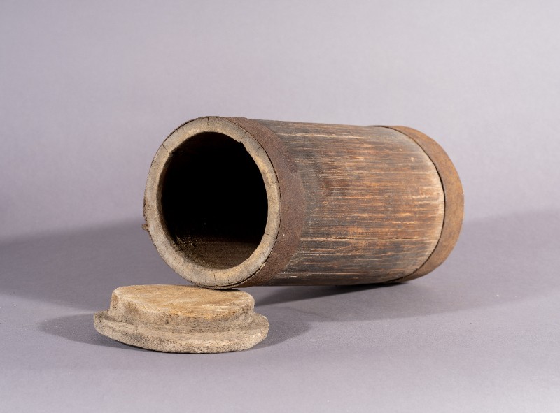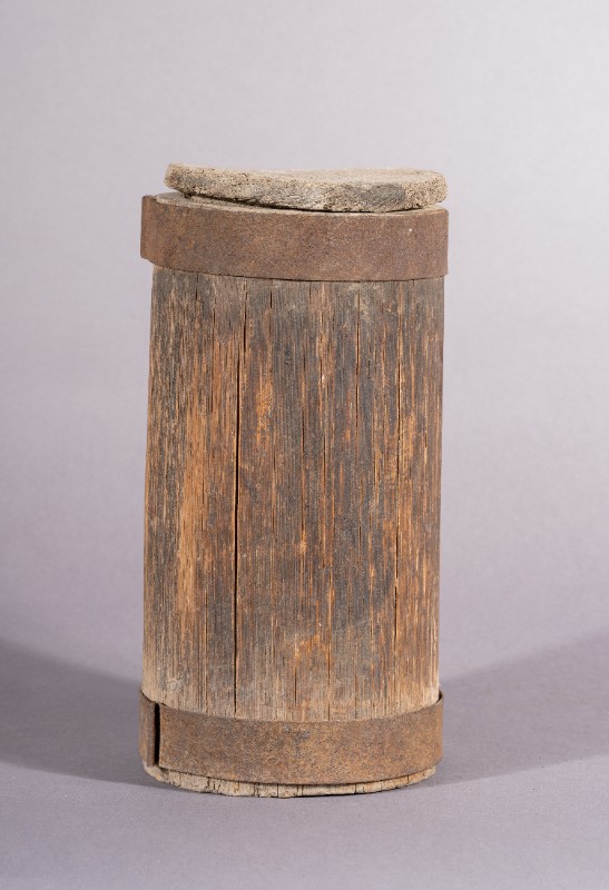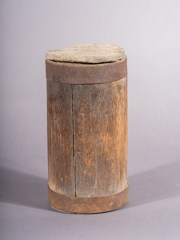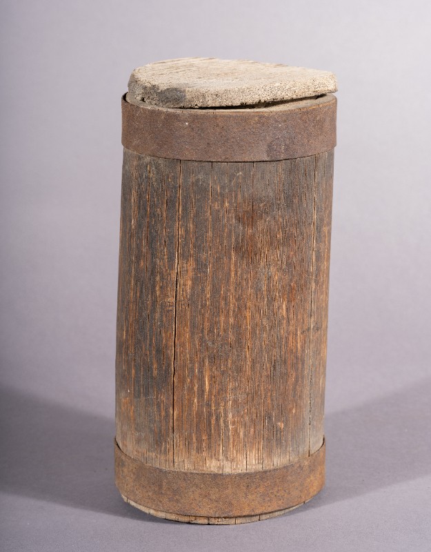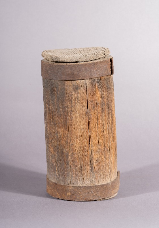 小木桶,材质为木,器身基本完整。上世纪50年代,三段地牧民开展社会主义建设所使用的木桶。现存于三段地革命历史纪念馆。