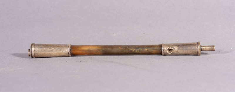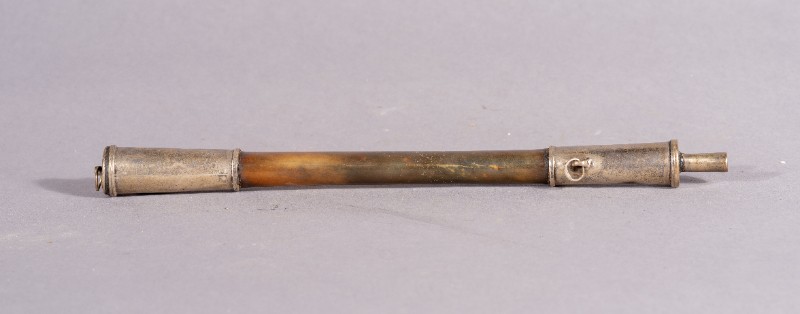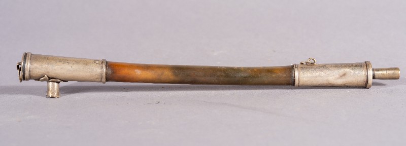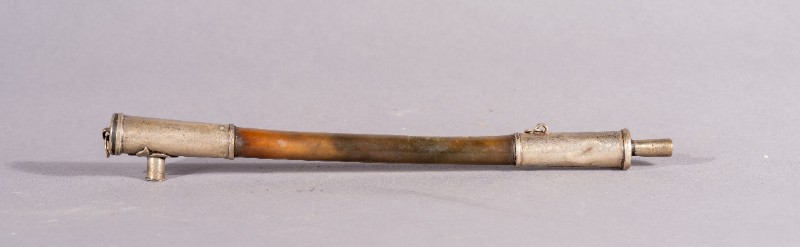 鹰骨水烟枪,材质为骨、银,器身完整。1940年后,鄂托克旗上层开明人士所使用的鹰骨镶银水烟枪。现存于三段地革命历史纪念馆。