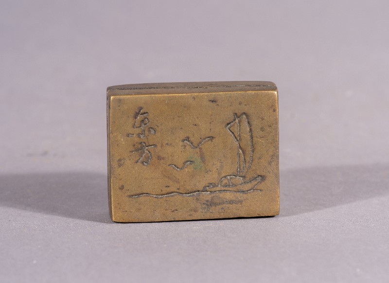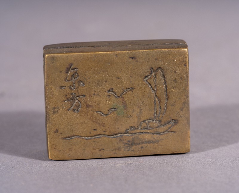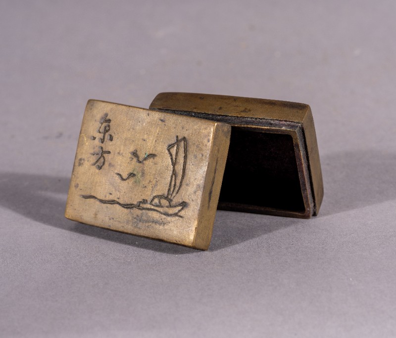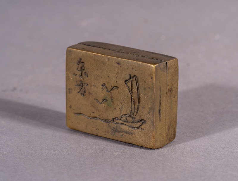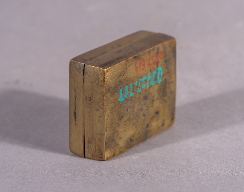 铜墨盒,材质为铜,器身基本完整。上世纪50年代,鄂托克旗文化工作者使用过的黄铜墨盒,上刻有“东方”两字。现存于三段地革命历史纪念馆。