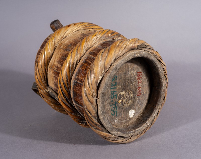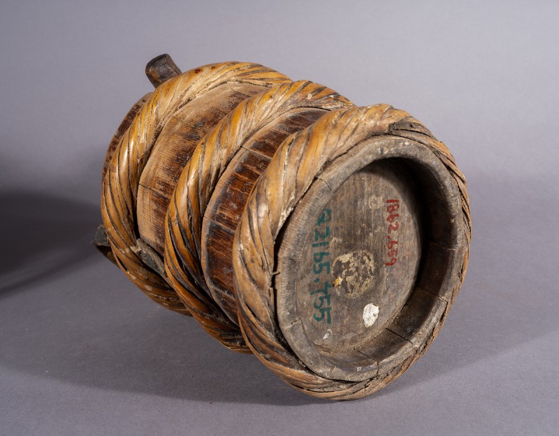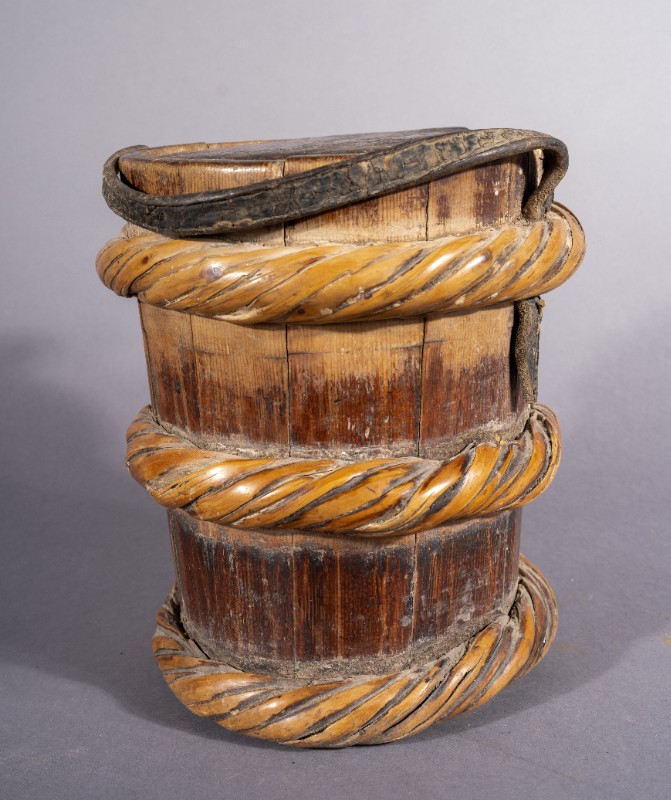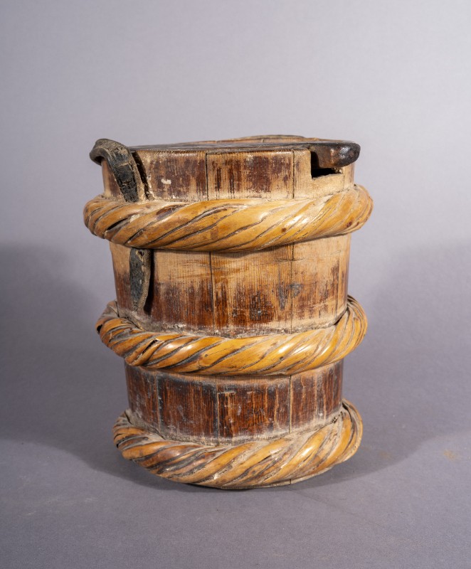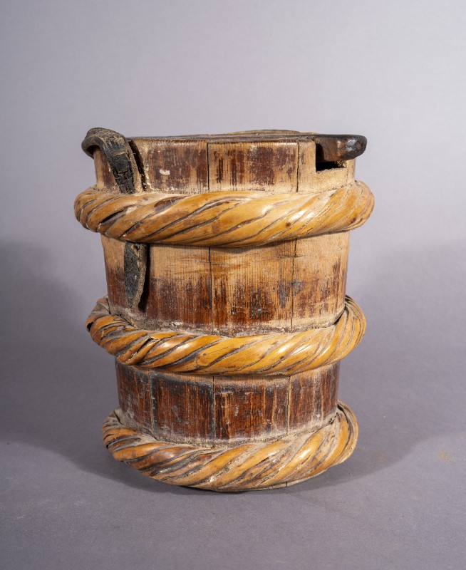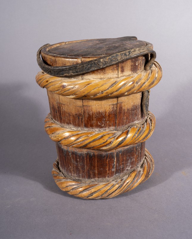 小型木奶桶(带盖),材质为木,表面有污渍。民国时期,三段地地下革命工作者使用过的木奶桶。现存于三段地革命历史纪念馆。