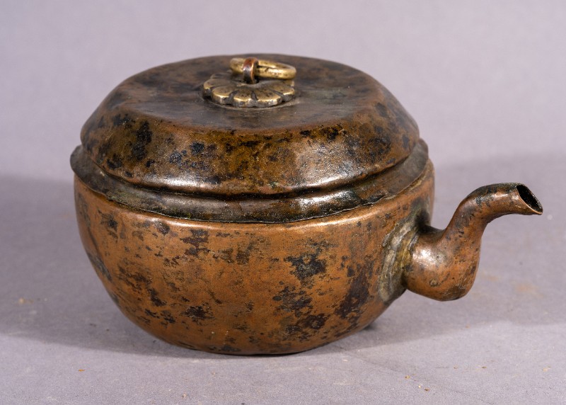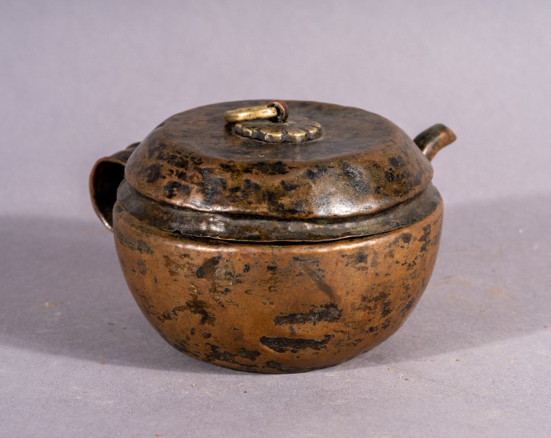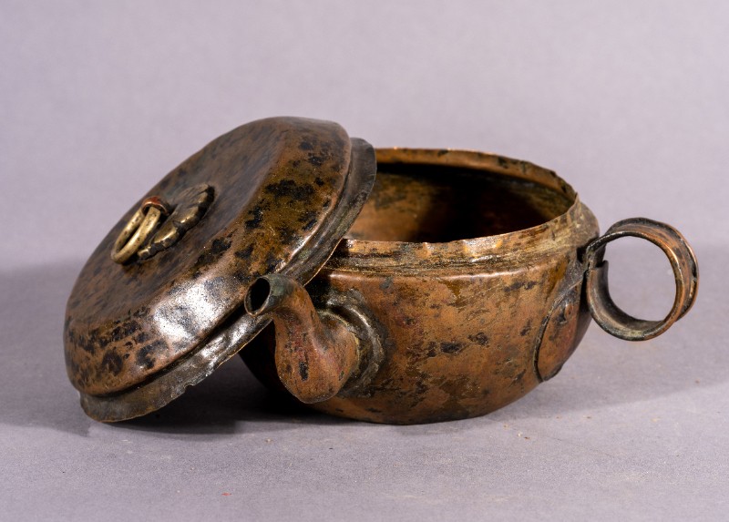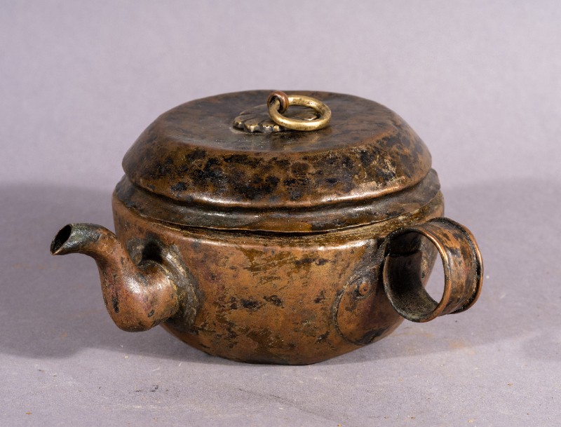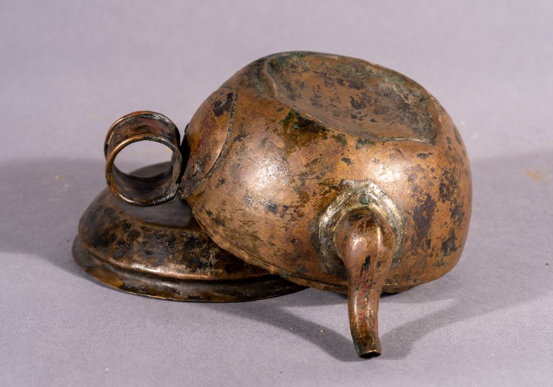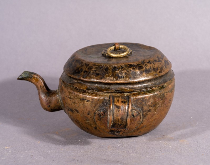 铜偏嘴壶,材质为铜,器身基本完整。民国时期,三段地爱国人士所使用过的铜偏嘴壶。现存于三段地革命历史纪念馆。