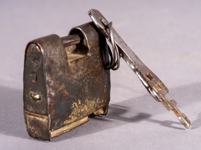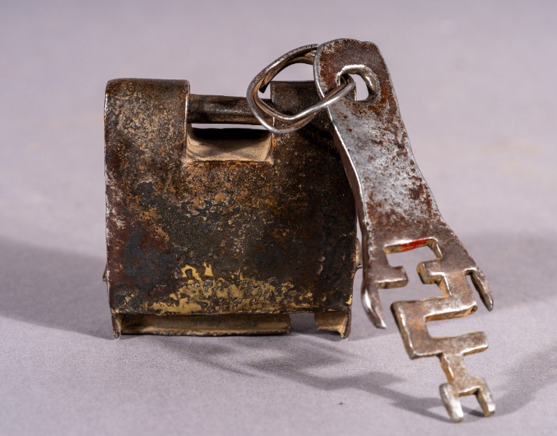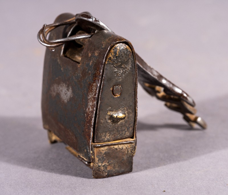 铁锁,质地为铁,上世纪50-60年代,三段地农牧民使用过的铁锁,基本完整。