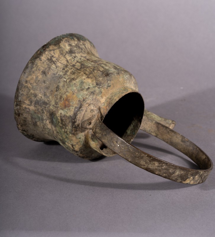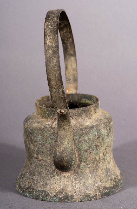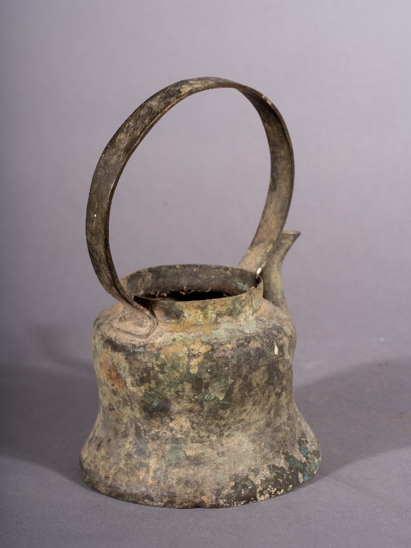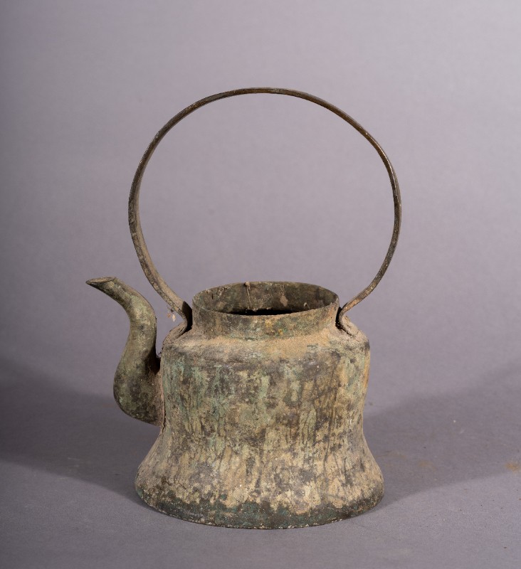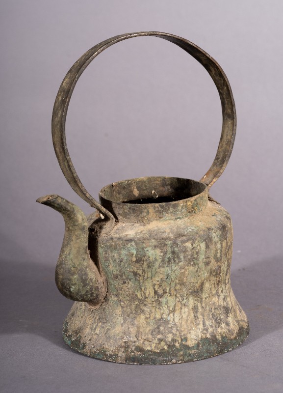 酥油壶,质地为铜,三段地牧民接待地下党员,熬制酥油所使用的酥油壶,污渍。现藏于三段地革命历史纪念馆。