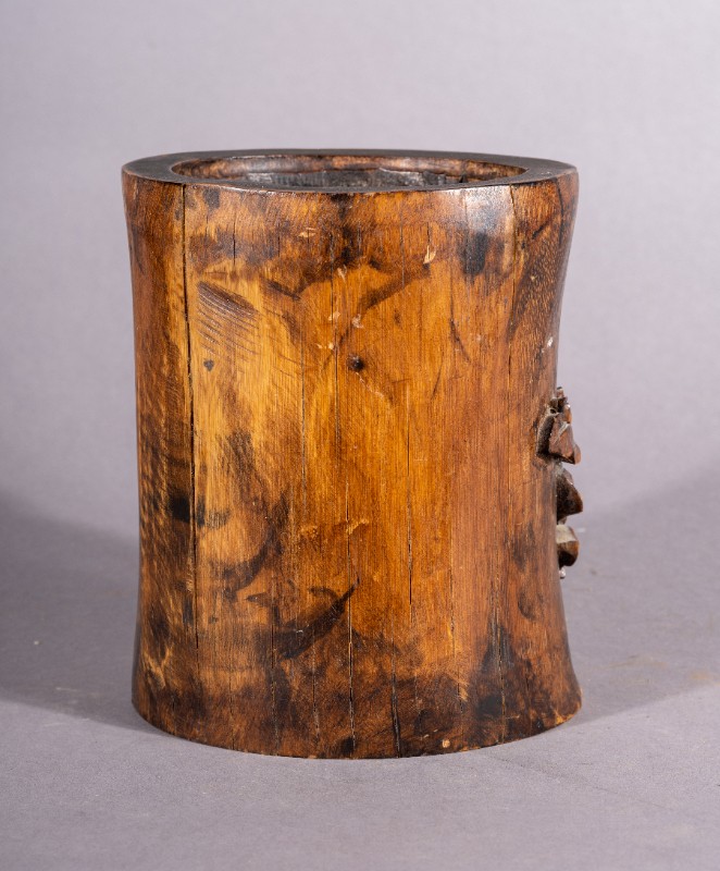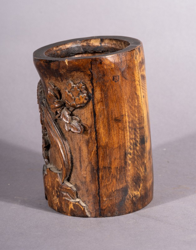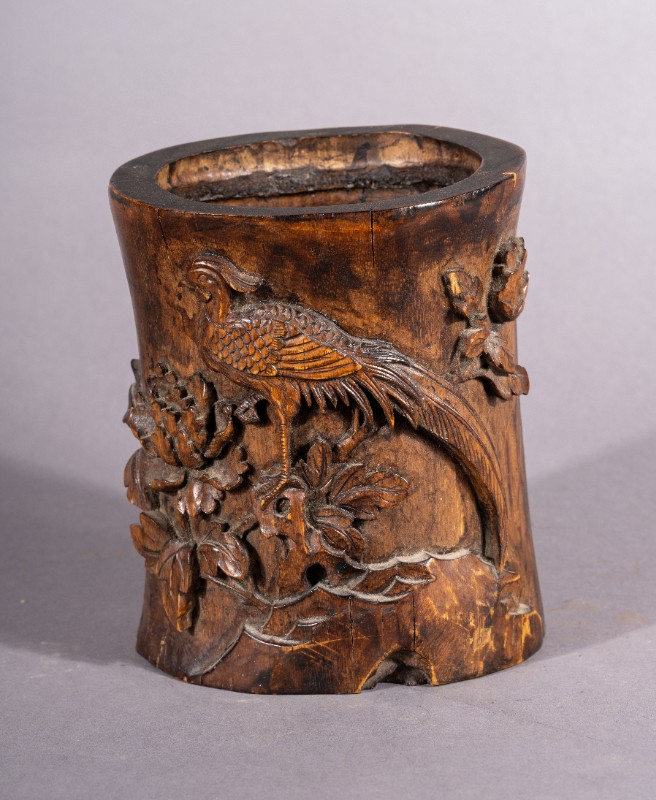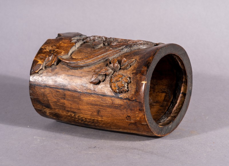 民国时期,三段地地下工作者所使用过的雕花笔筒,有裂纹。现藏于三段地革命历史纪念馆。