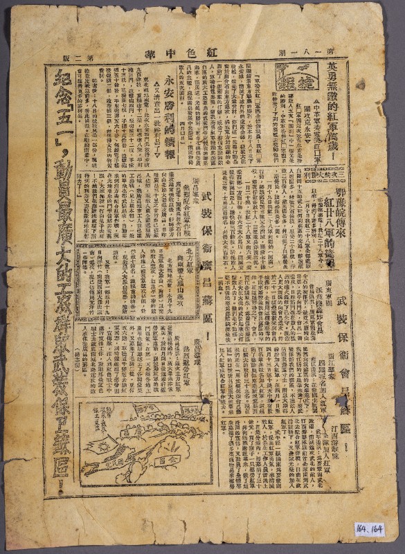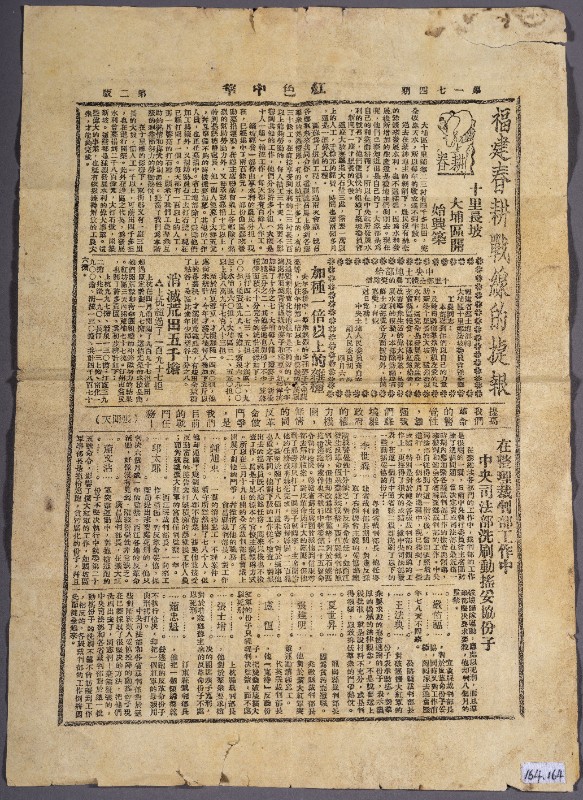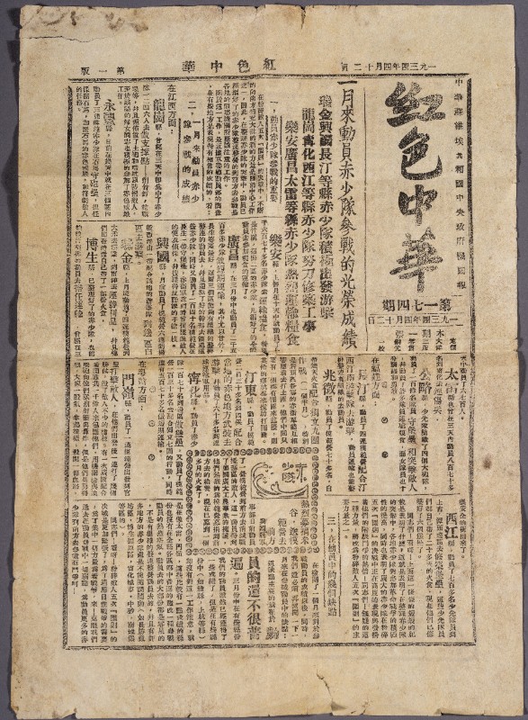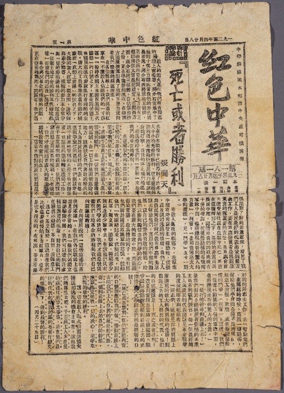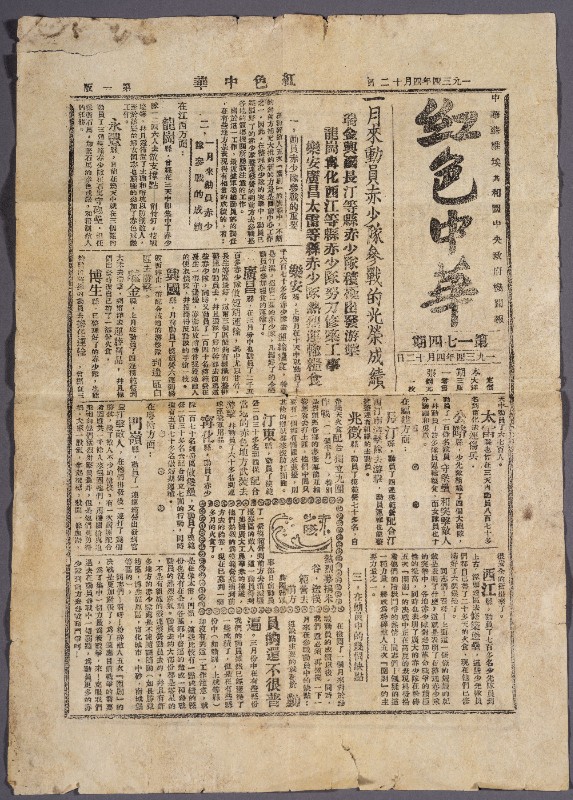 第一次国内革命战争时期,《红色中华》机关报,作用是发挥中央政府对于中国苏维埃运动的积极领导作用......以推翻帝国主义国民党的统治,使革命在一省或者多省首先胜利,达到到全国胜利,现藏于三段地革命历史纪念馆。