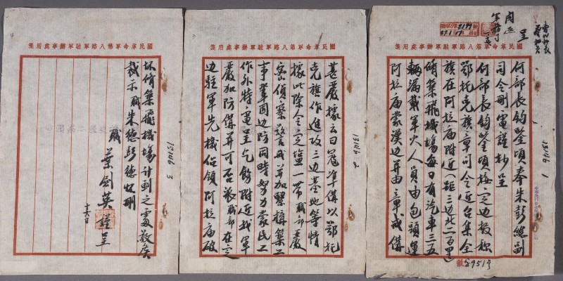 抗战时期,朱德、彭德怀委托叶剑英上书重庆国民政府要员何应钦,主要针对鄂托克旗战略地位提出了我方的看法,保存完整。现藏于三段地革命历史纪念馆。