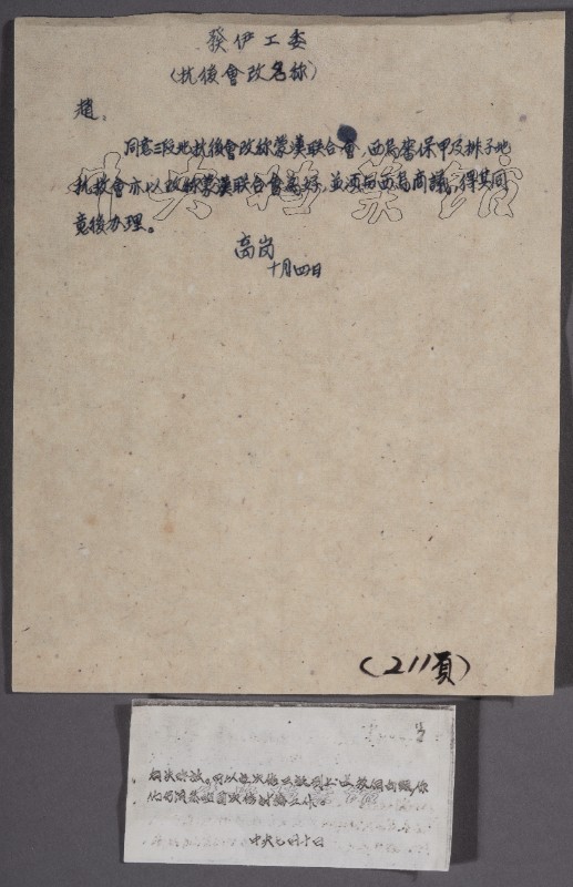 西北局高岗至伊盟工委书记赵通儒的指示,现藏于三段地革命历史纪念馆。