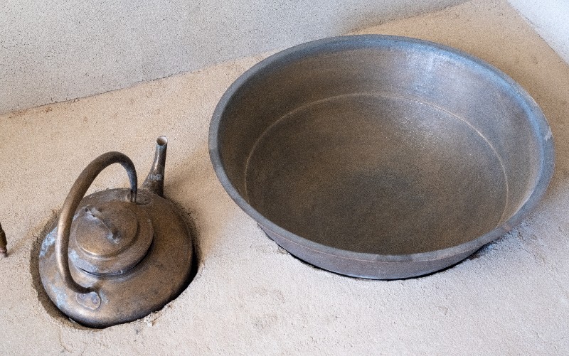 80年代,桃力民地区牧民使用过的铁锅和铜茶壶。材质为铁、铜,器型完整。现存于桃力民抗日革命根据地旧址集群新三师政治部复原院落。