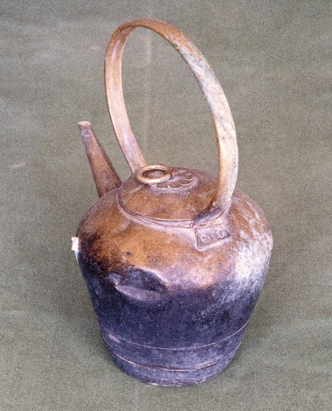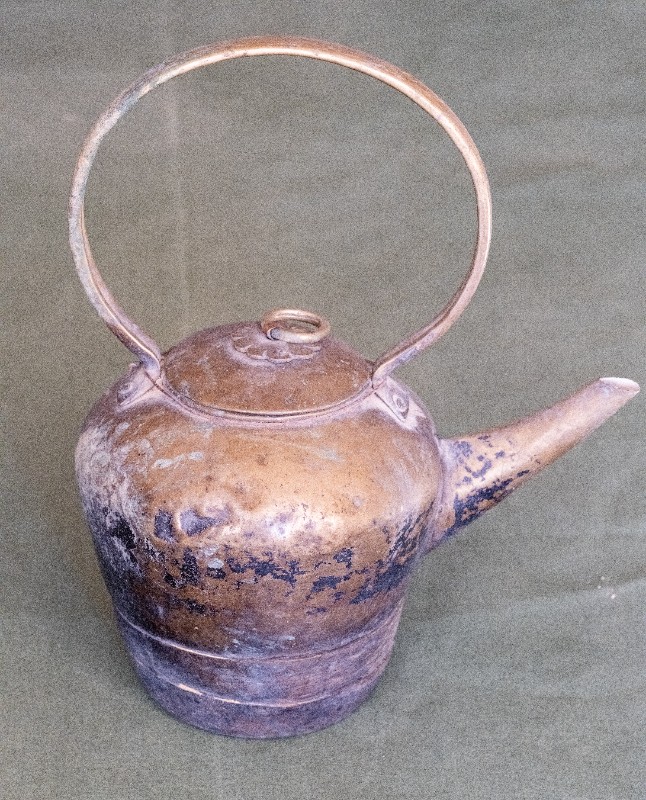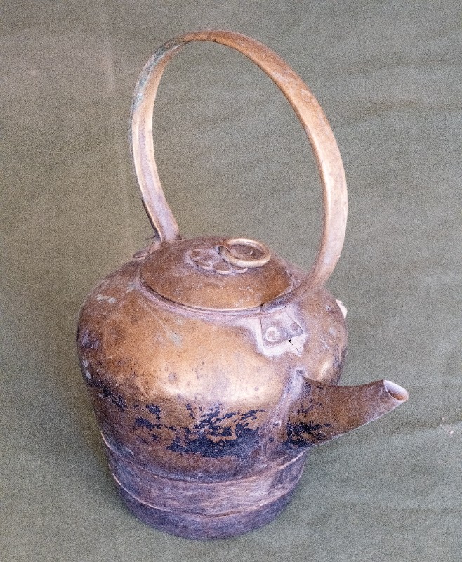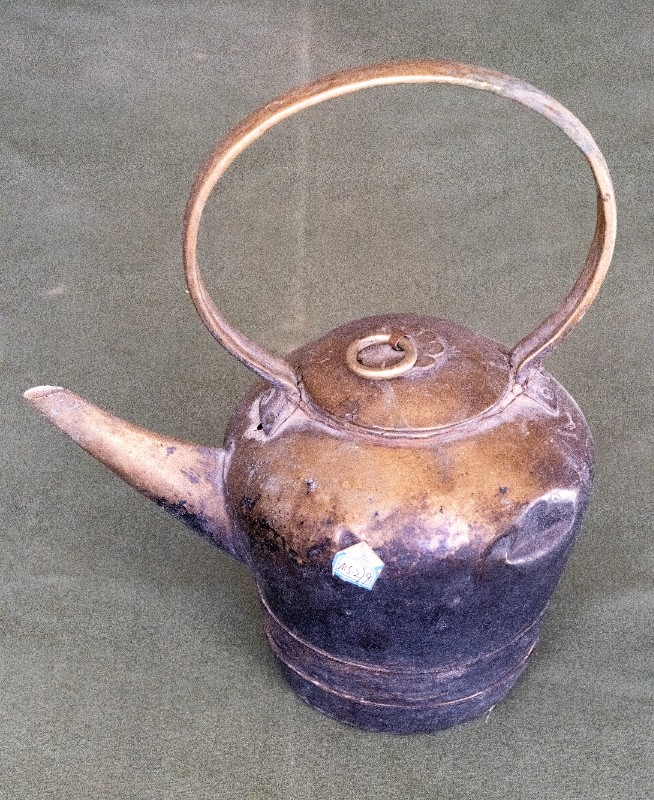 抗日战争时期,新三师官兵驻扎在桃力民地区时使用过的铜壶,材质为黄铜,器型完整,表面锈迹。现存于桃力民抗日革命根据地旧址集群新三师政治部复原院落。
