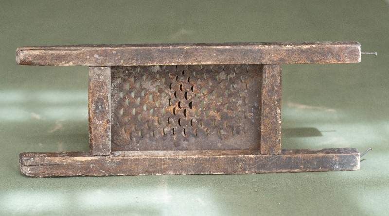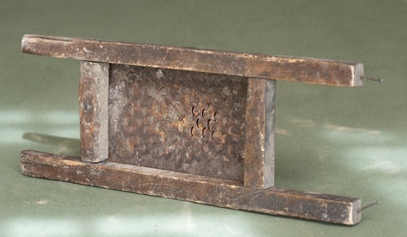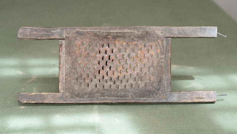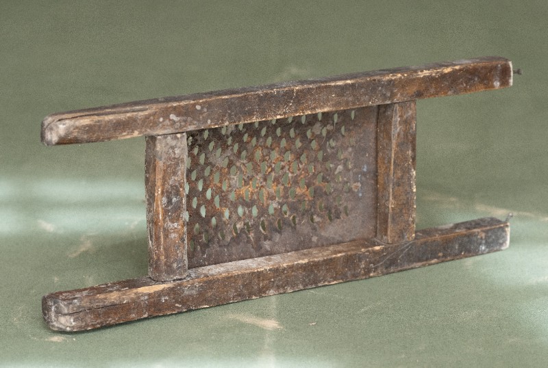 抗日战争时期,新三师官兵驻扎在桃力民地区时炊事班使用过的擦子。材质为铁、木,器型较完整,表面有锈迹。现存于桃力民抗日革命根据地旧址集群新三师政治部复原院落。