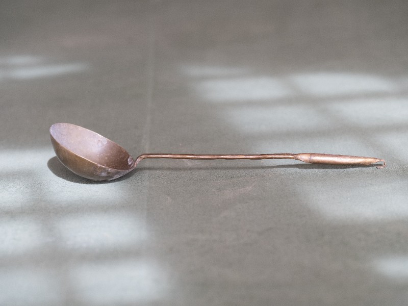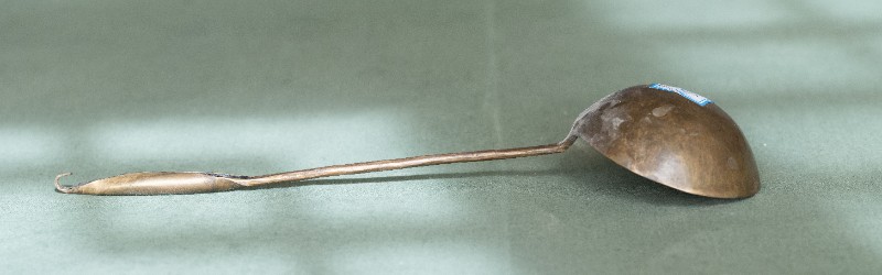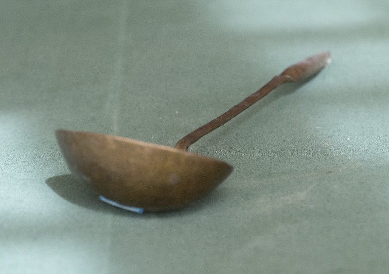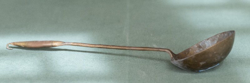 抗日战争时期,新三师官兵驻扎在桃力民地区时炊事班使用过的铜马勺。材质为黄铜,器型完整。现存于桃力民抗日革命根据地旧址集群新三师政治部复原院落。