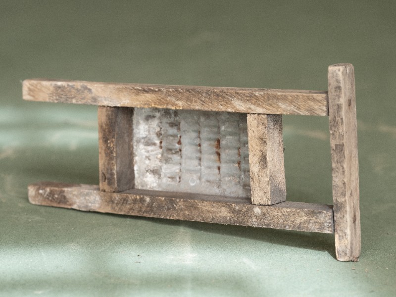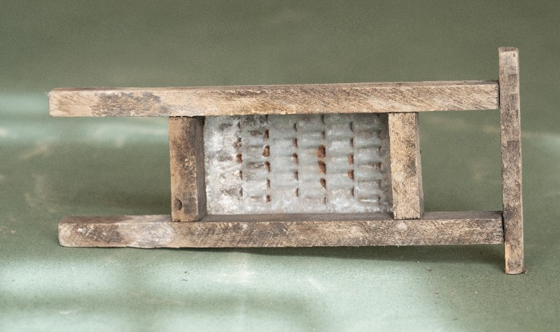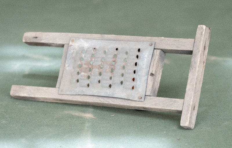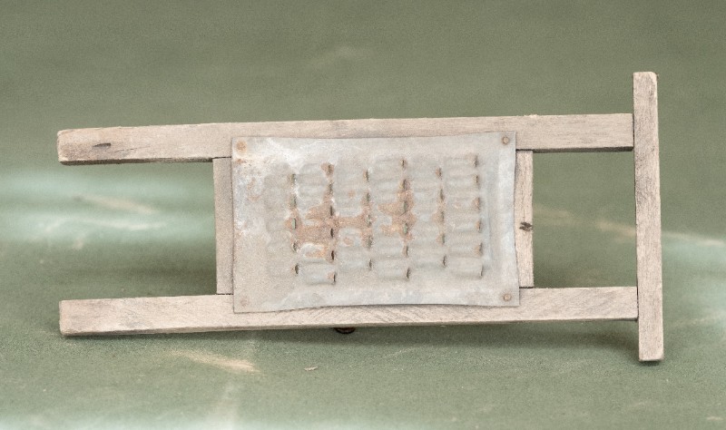 抗日战争时期,新三师官兵驻扎在桃力民地区时炊事班使用过的擦子。材质为铁、木,器型完整,表面有锈迹。现存于桃力民抗日革命根据地旧址集群新三师政治部复原院落。