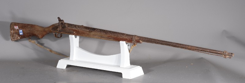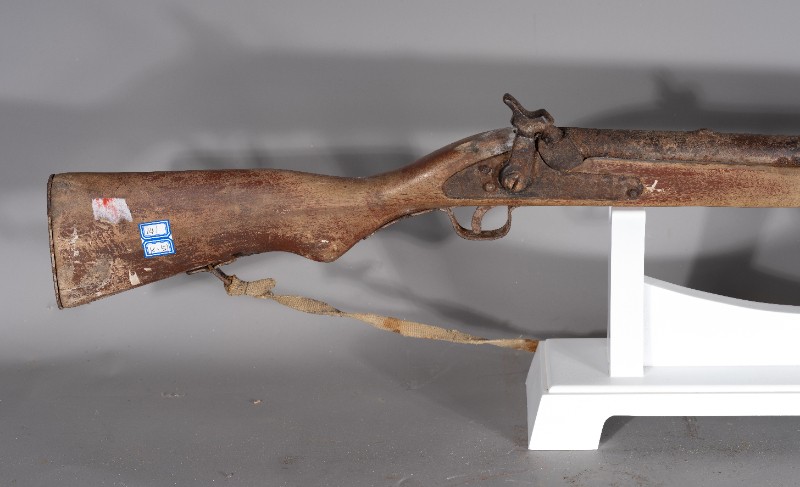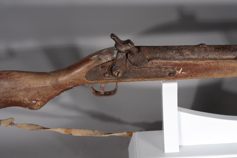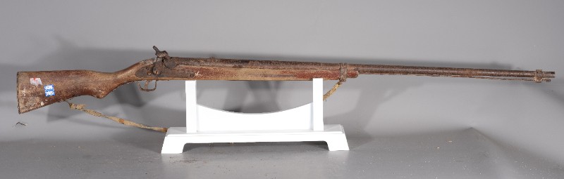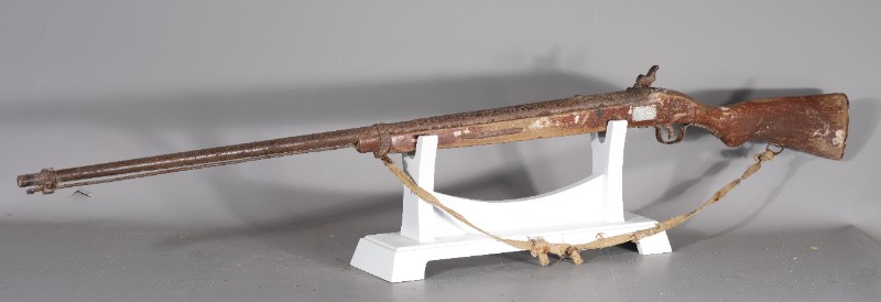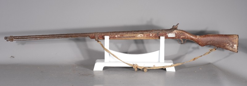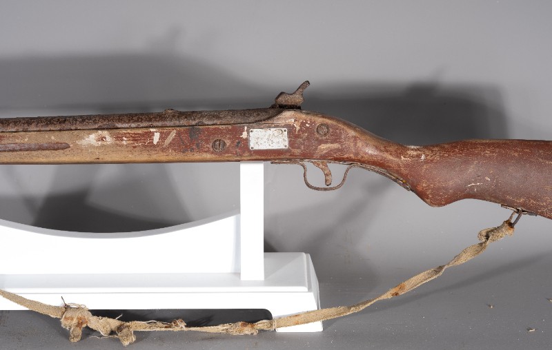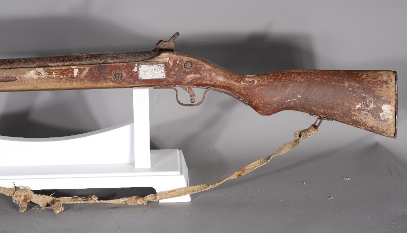 抗日战争时期,桃力民抗日自卫军在桃力民地区使用过的自制火枪,材质为木和铁,表面有锈迹,器身有磨损。现存于桃力民抗日根据地史实陈列馆。