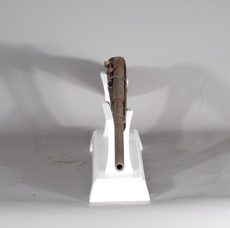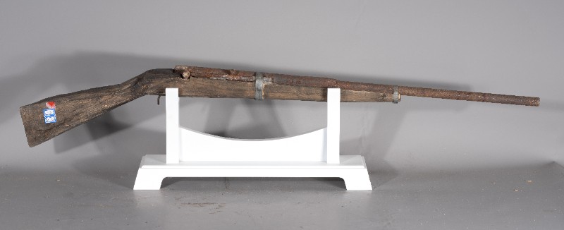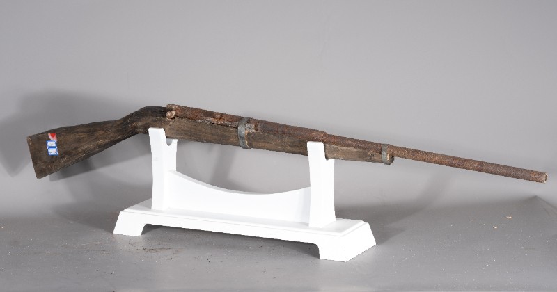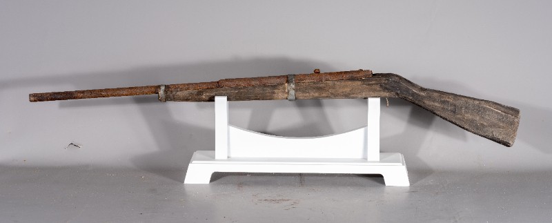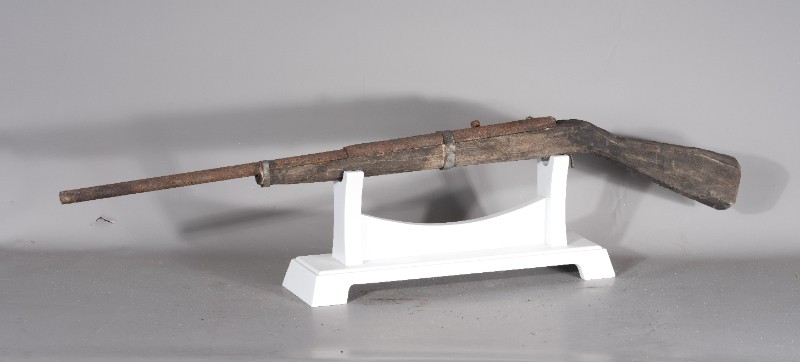 抗日战争时期,桃力民抗日自卫军在桃力民地区使用过的自制火枪,材质为木和铁,表面有轻微破损。现存于桃力民抗日根据地史实陈列馆。