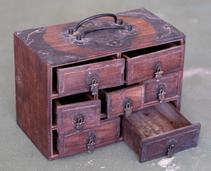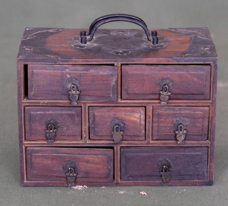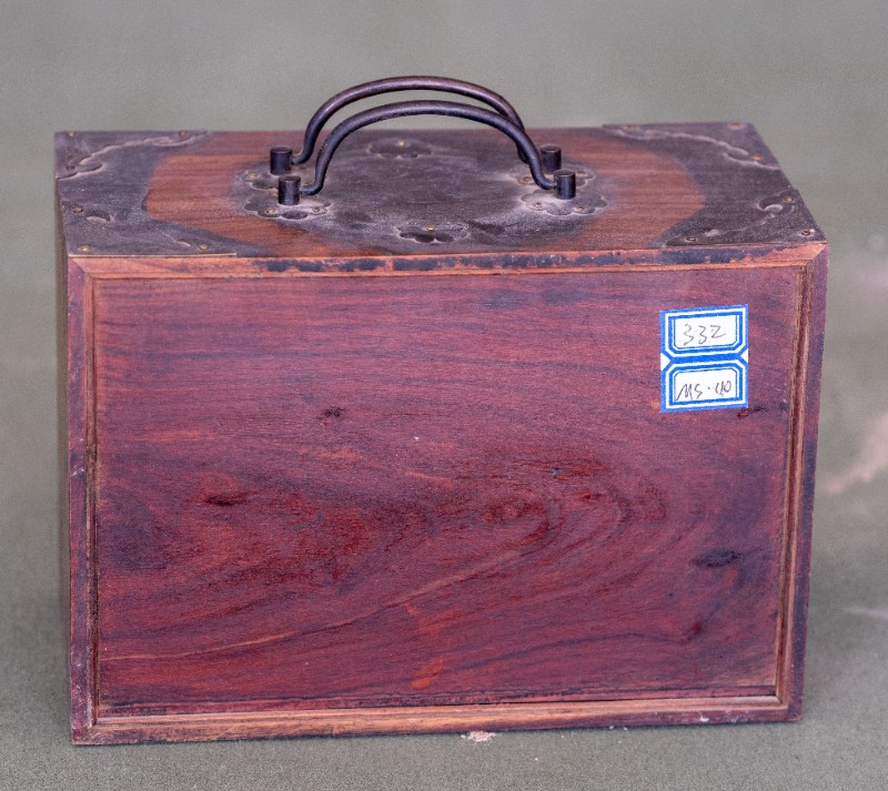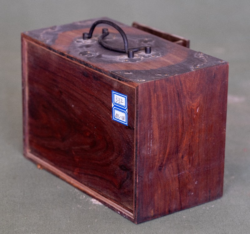 民国时期,伊克昭盟工委工作人员在桃力民地区工作时使用过的储物箱,材质为木、铜。现存于桃力民抗日革命根据地旧址集群伊盟工委复原院落。
