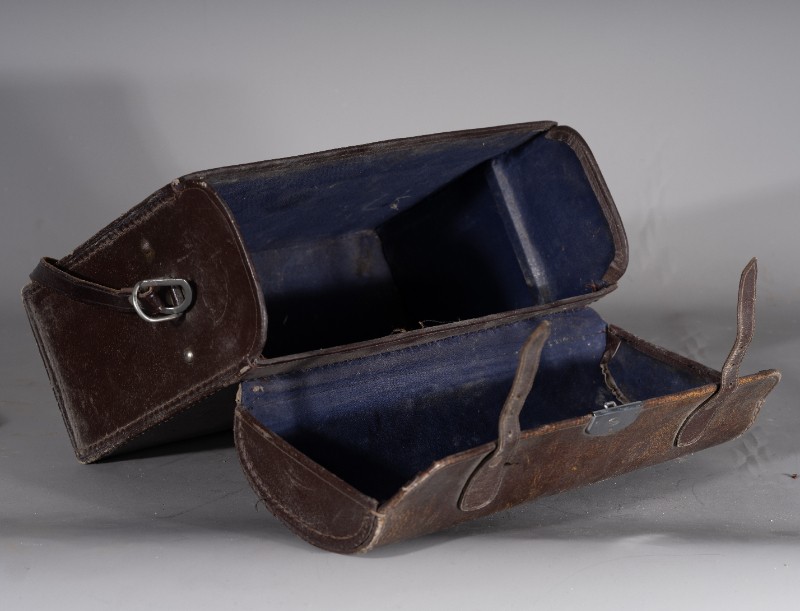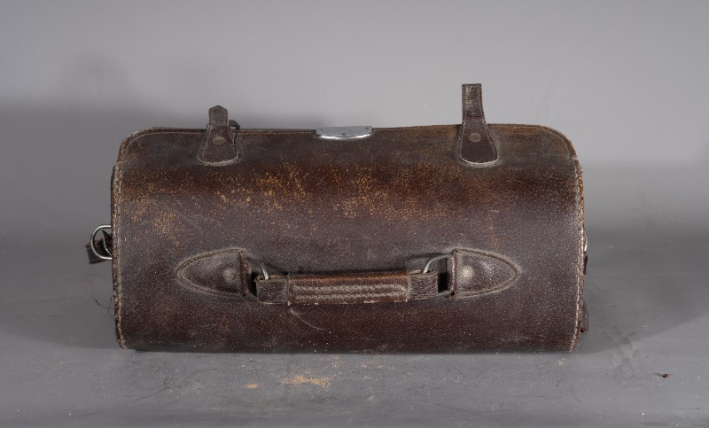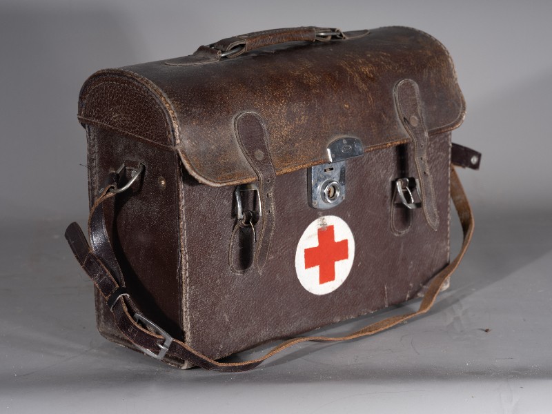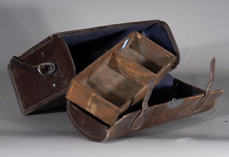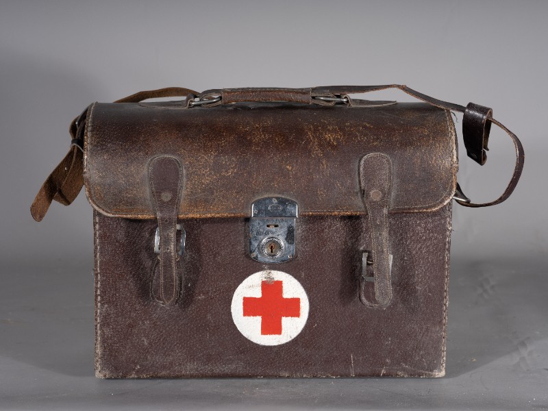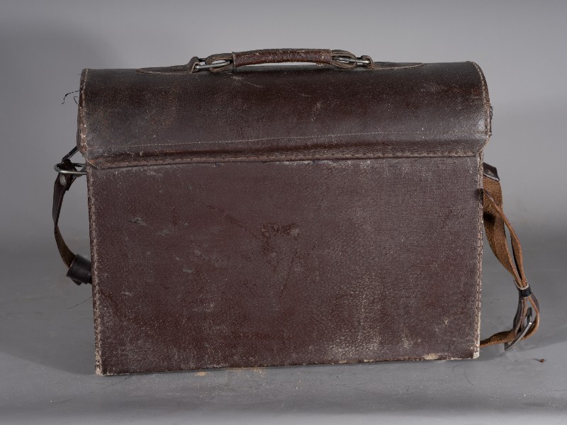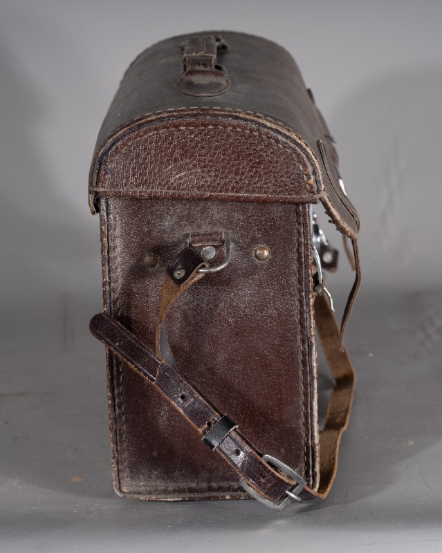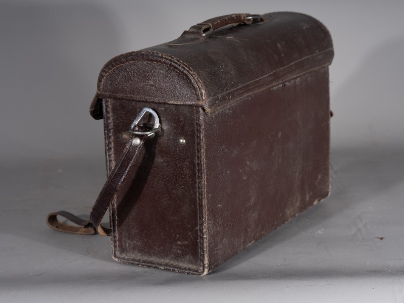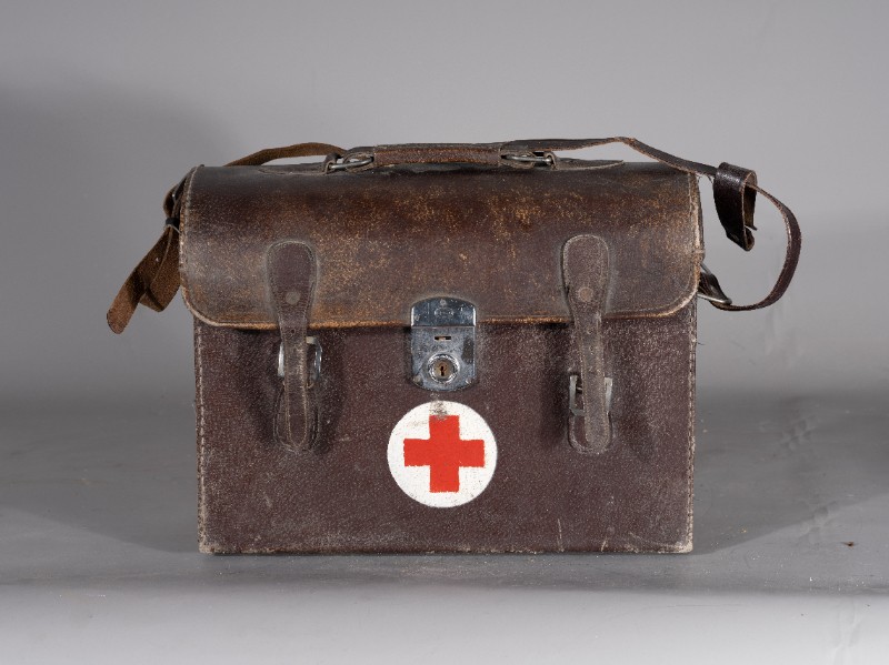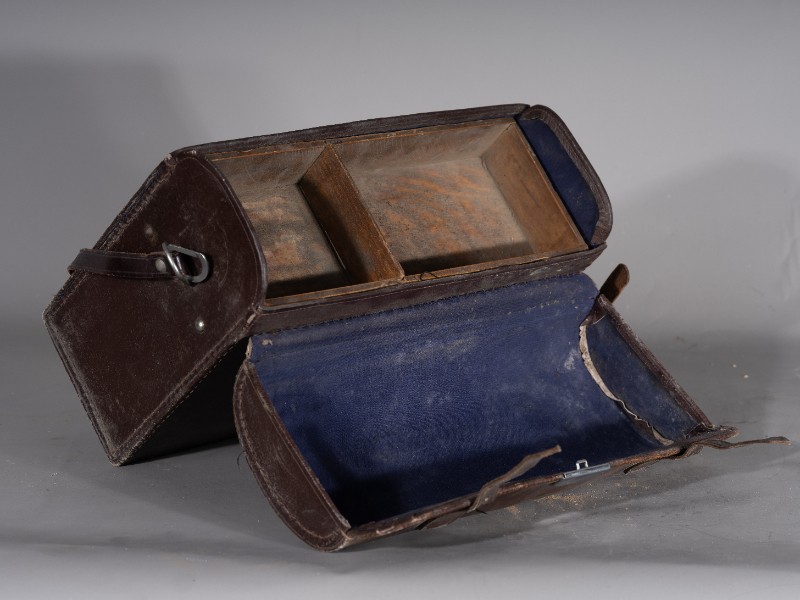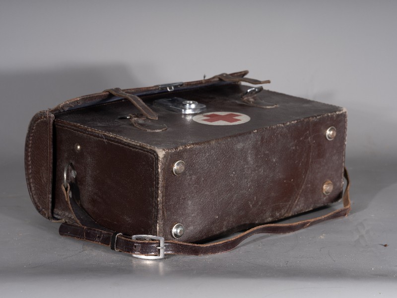 抗日战争时期,八路军医疗队在桃力民地区使用过的行军医药箱,材质为牛皮、木,器型较完整,有磨损。现存于桃力民抗日根据地史实陈列馆。