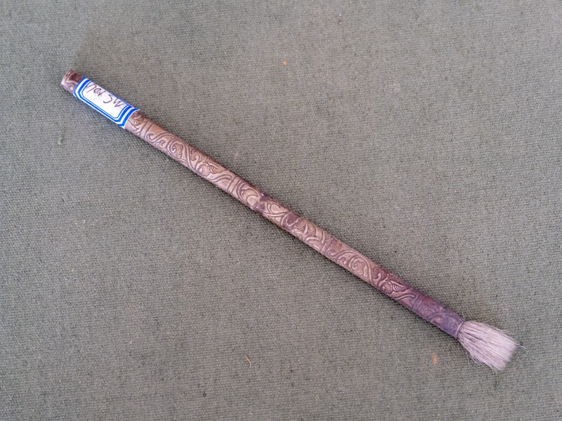 民国时期,伊克昭盟工委干部在桃力民地区工作时使用过的银杆雕花毛笔,材质为毛、银。器型完整。现存于桃力民抗日革命根据地旧址集群伊盟工委复原院落。