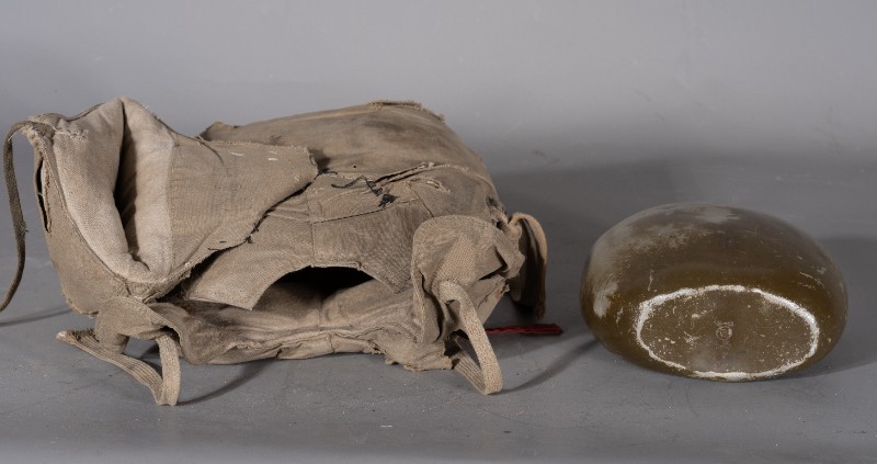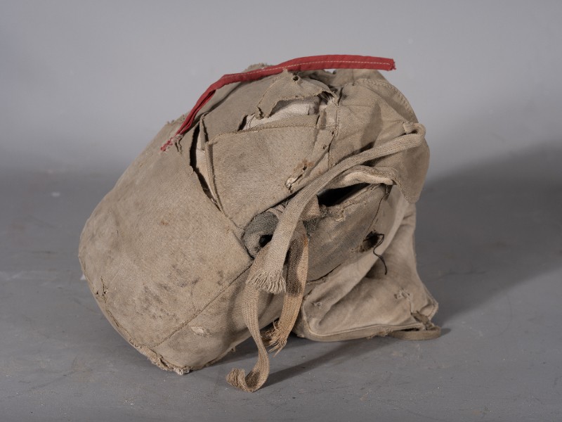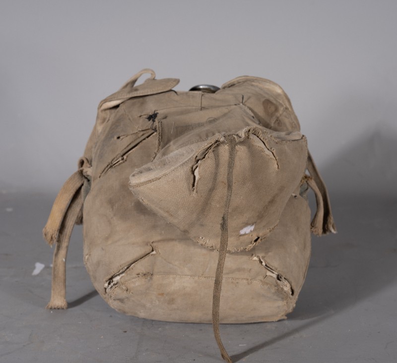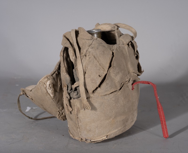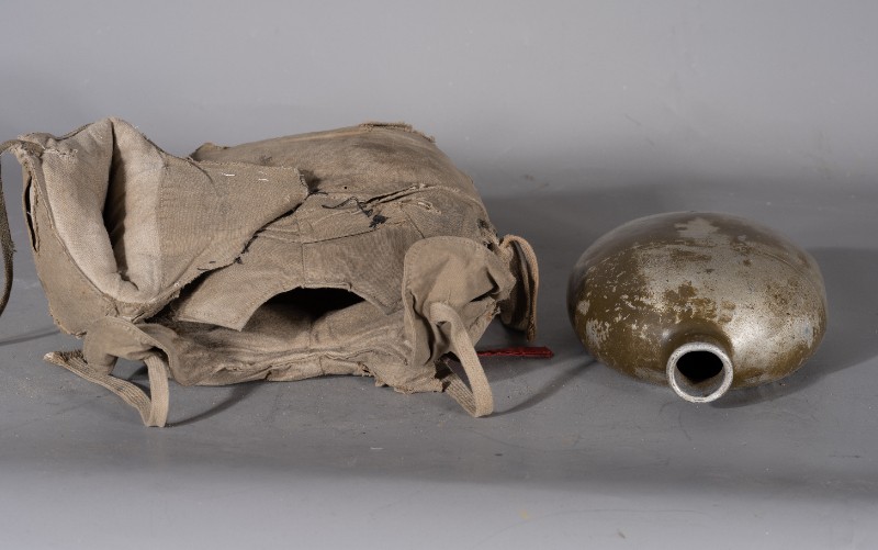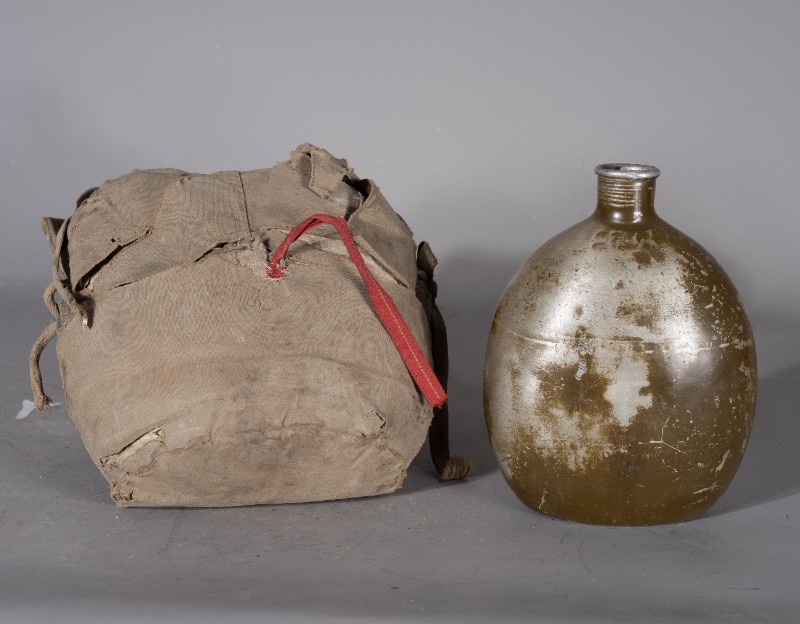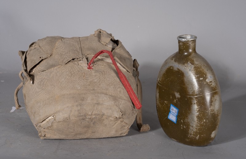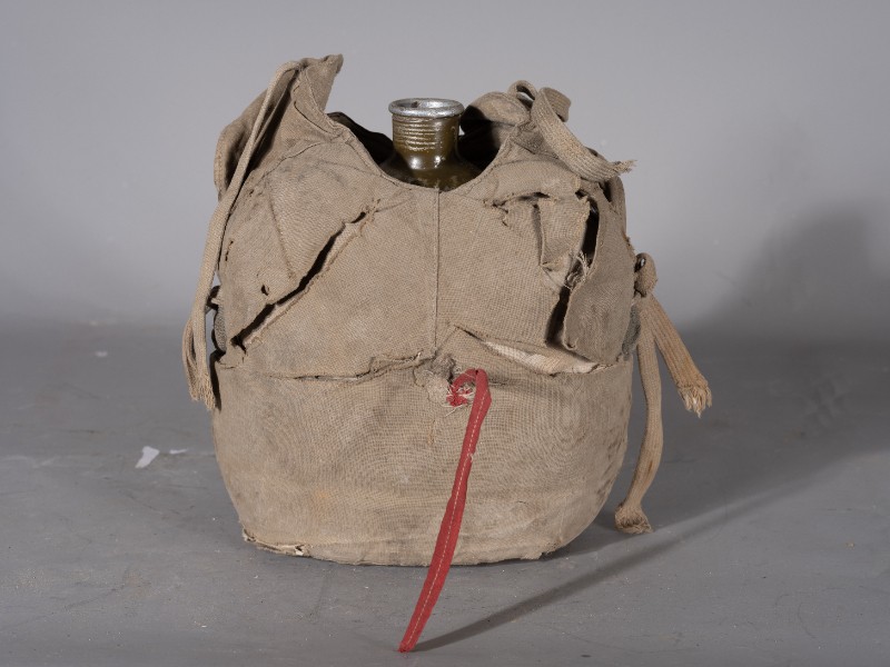 抗日战争时期,桃力民抗日自卫军在君忽图庙战役中缴获的日本军用水壶,材质为铝、布,布面损坏,壶身漆面磨损。现存于桃力民抗日根据地史实陈列馆。