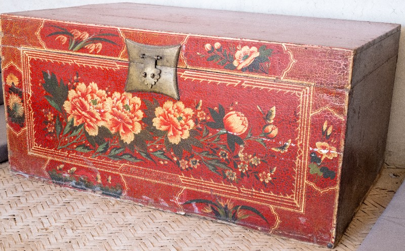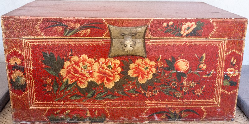 民国时期,中共绥蒙工委工作人员在桃力民地区工作时用来存放衣物的红漆木彩绘箱,材质为皮、木。民间征集、器型较完整,有裂纹。现存于桃力民抗日革命根据地旧址集群绥蒙工委复原院落。