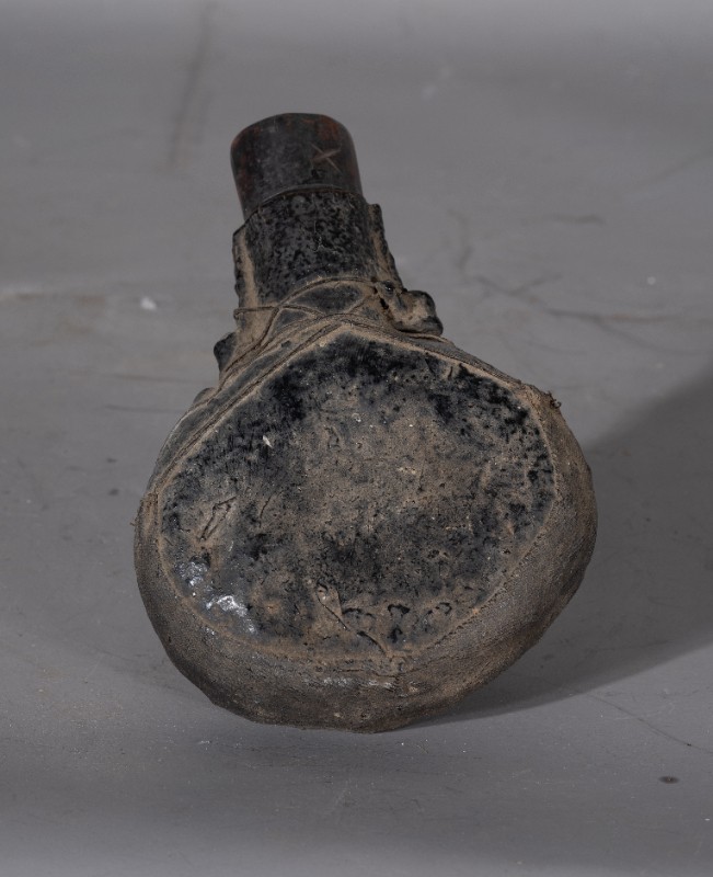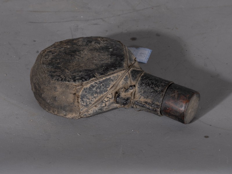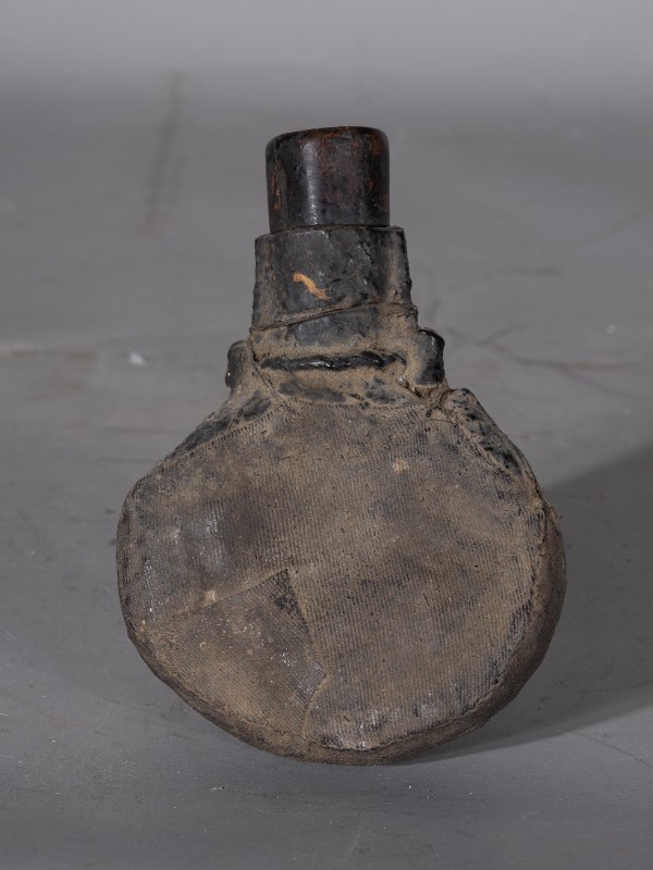 抗日战争时期,桃力民抗日自卫军在桃力民地区使用过的火药壶,材质为牛皮、木,器身有轻微磨损。现存于桃力民抗日根据地史实陈列馆。