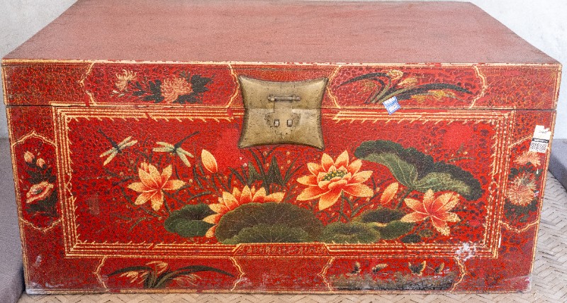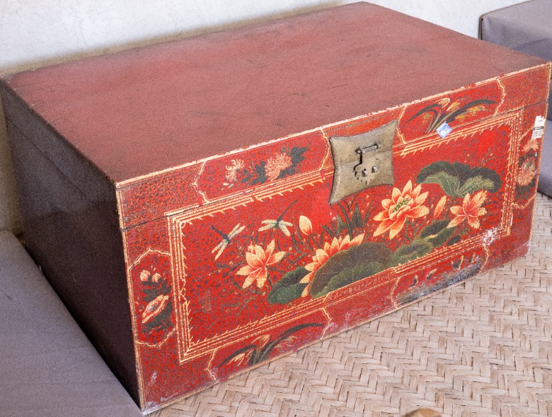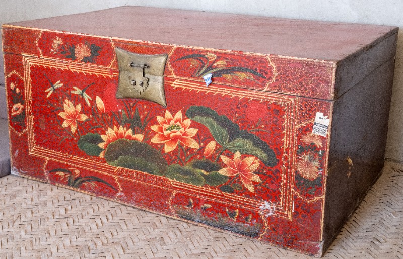 民国时期,中共绥蒙工委工作人员在桃力民地区工作时用来存放衣物的红漆木彩绘箱,正面印有荷花图案,材质为皮、木。民间征集、器型较完整,有裂纹。现存于桃力民抗日革命根据地旧址集群绥蒙工委复原院落。