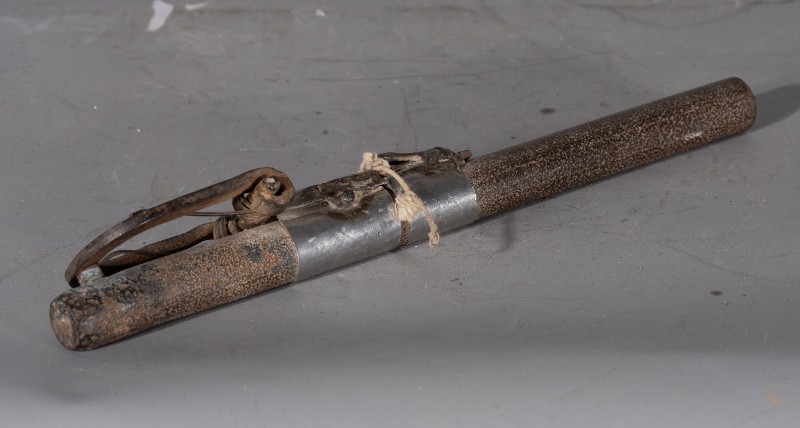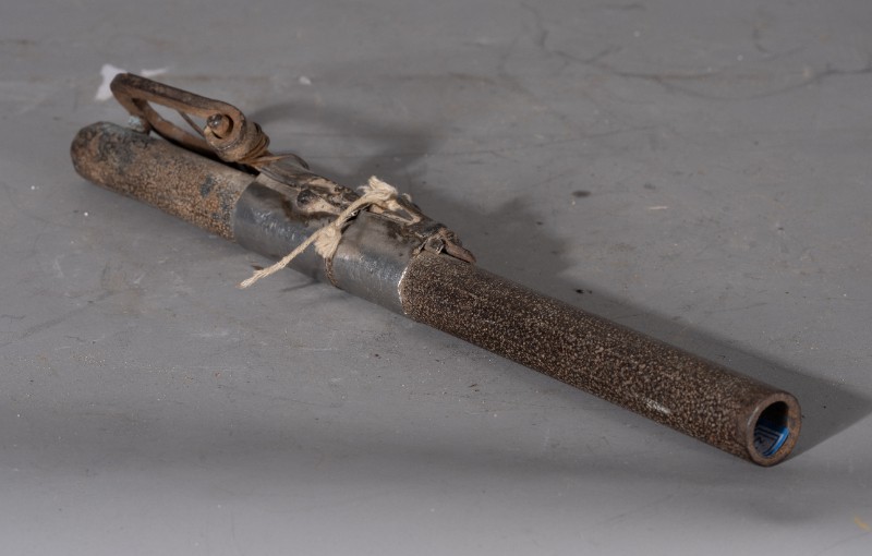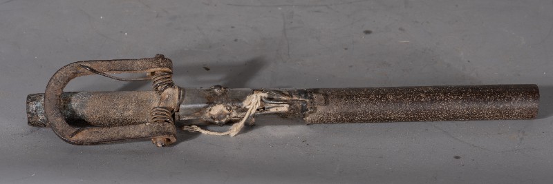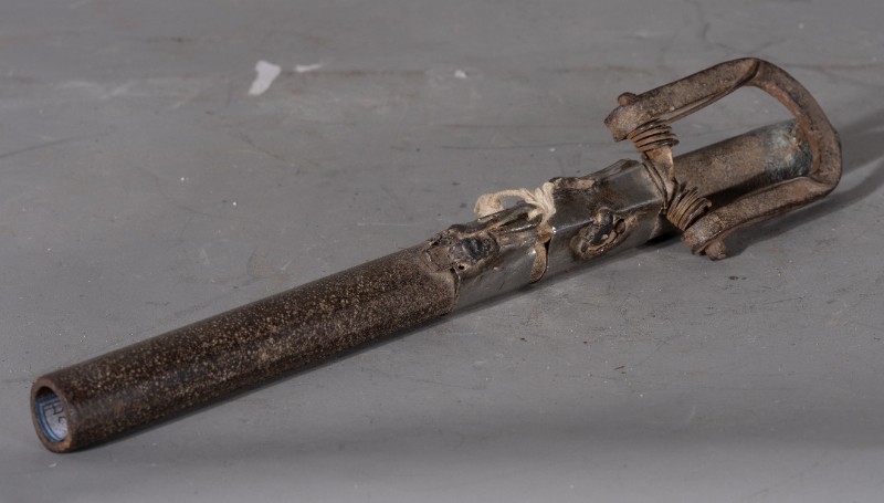 抗日战争时期,桃力民抗日自卫军在桃力民地区自制的地炮,材质为铁,器型完整。现存于桃力民抗日根据地史实陈列馆。
