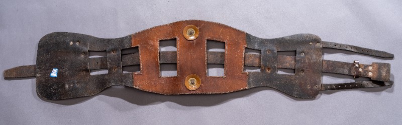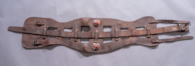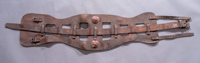 抗日战争时期,八路军骑兵团军官在桃力民地区使用过的军用腰带,材质为牛皮,器型完整。现存于桃力民抗日根据地史实陈列馆。